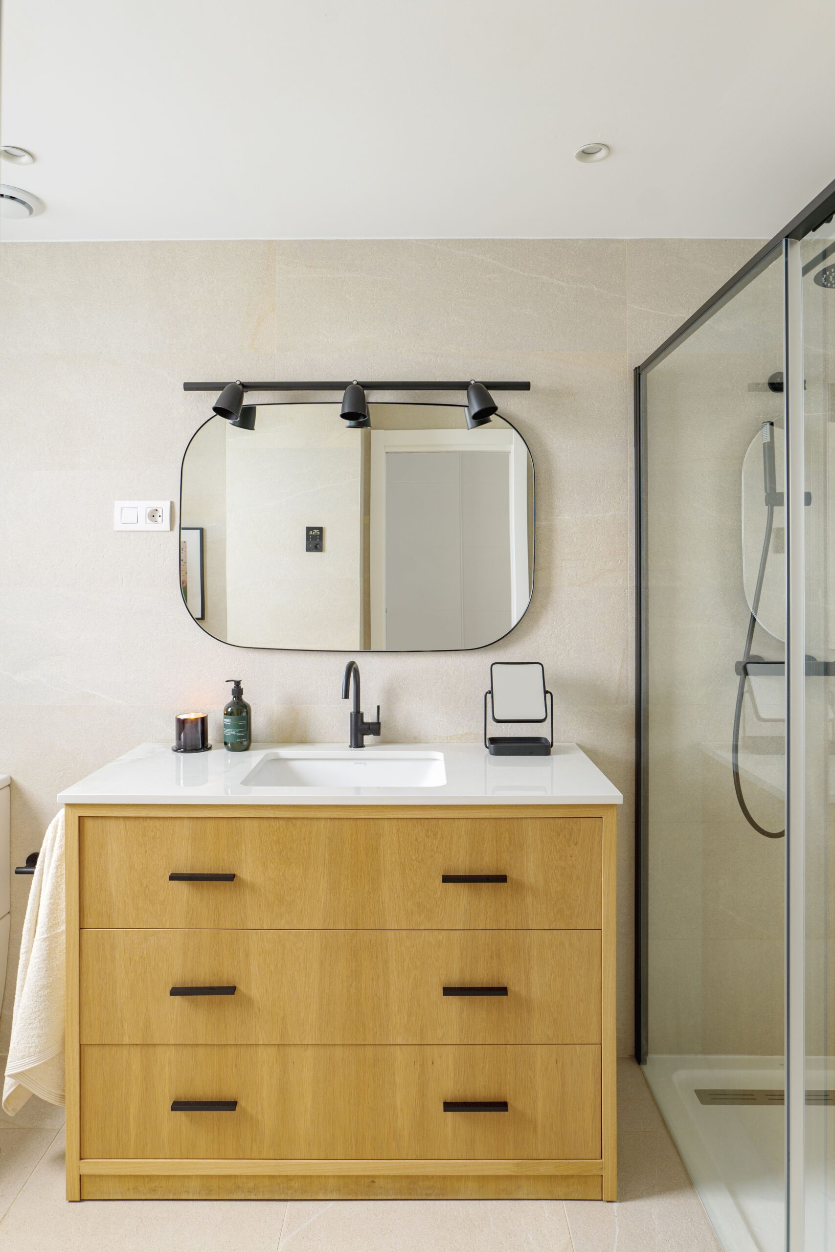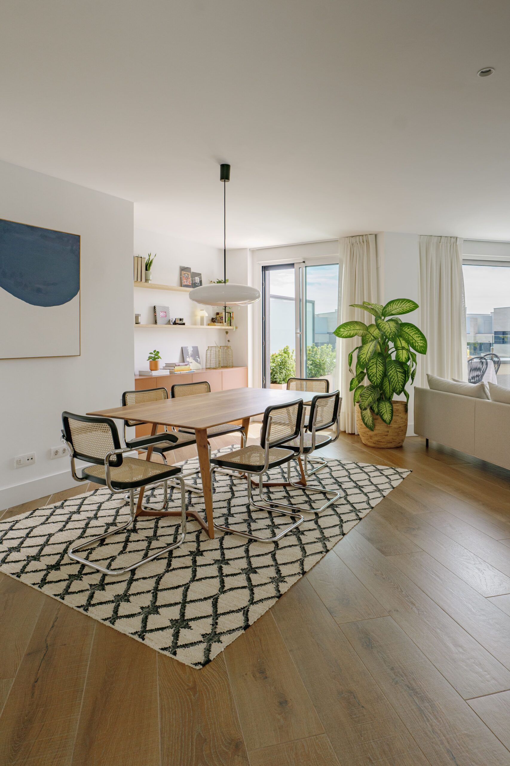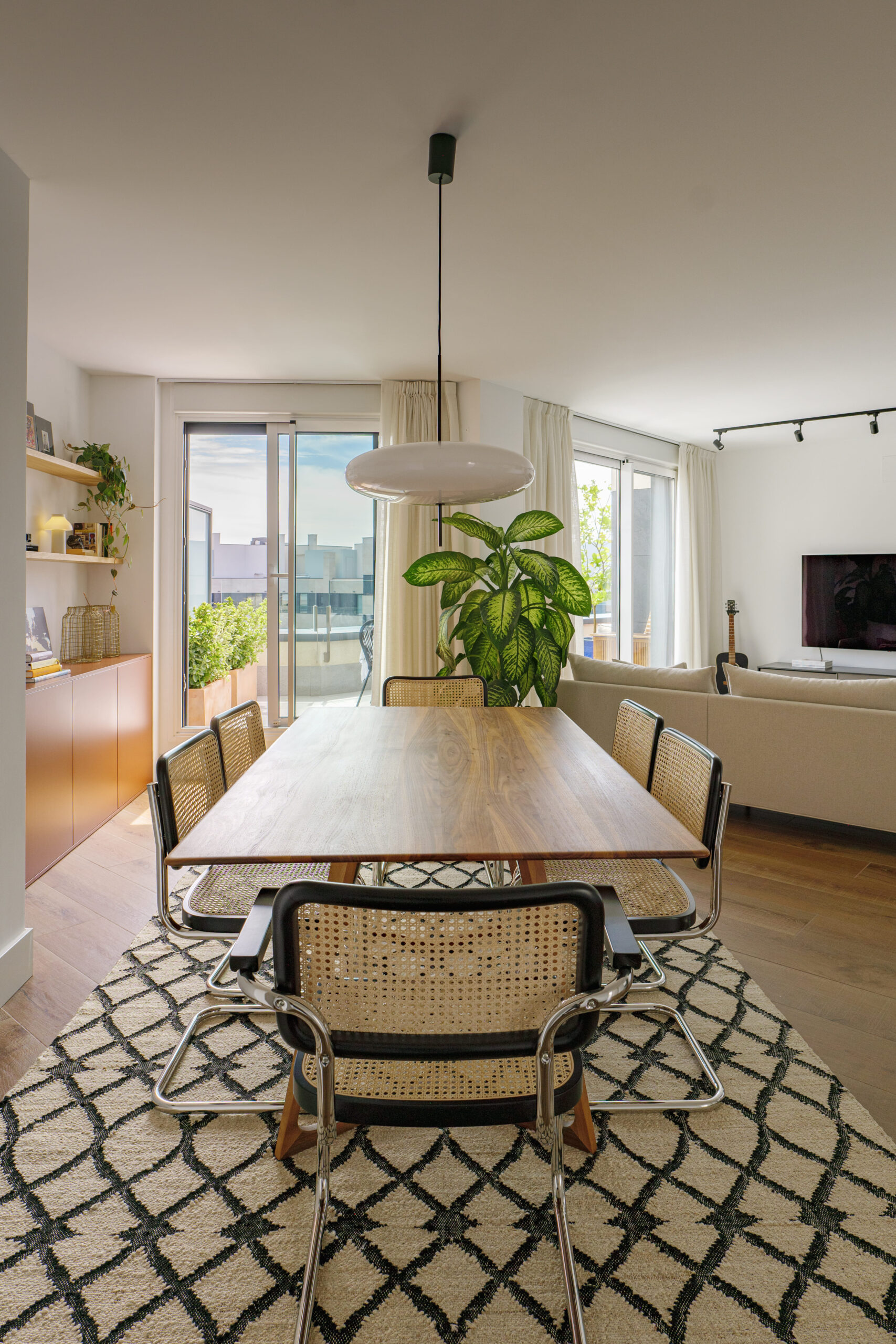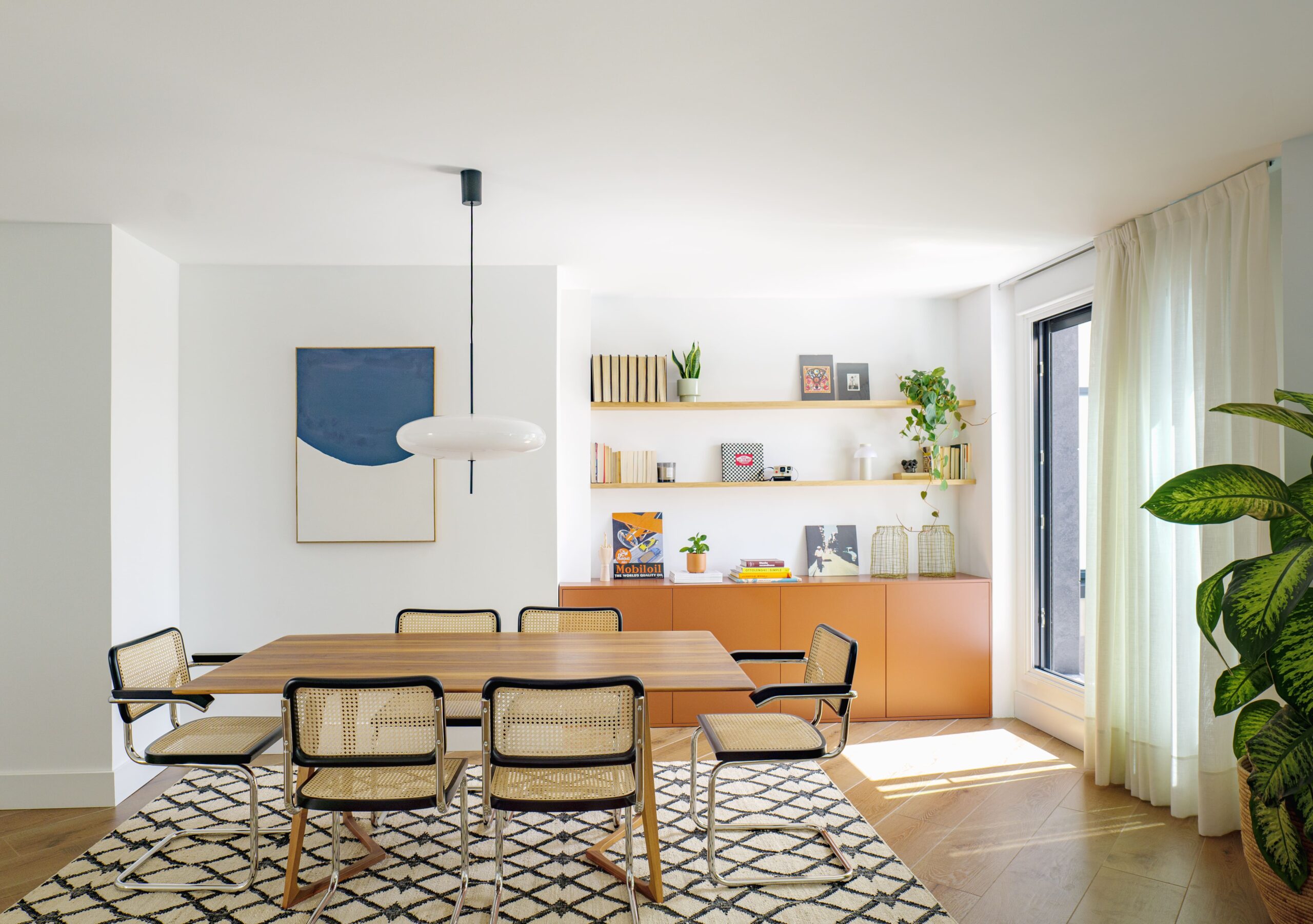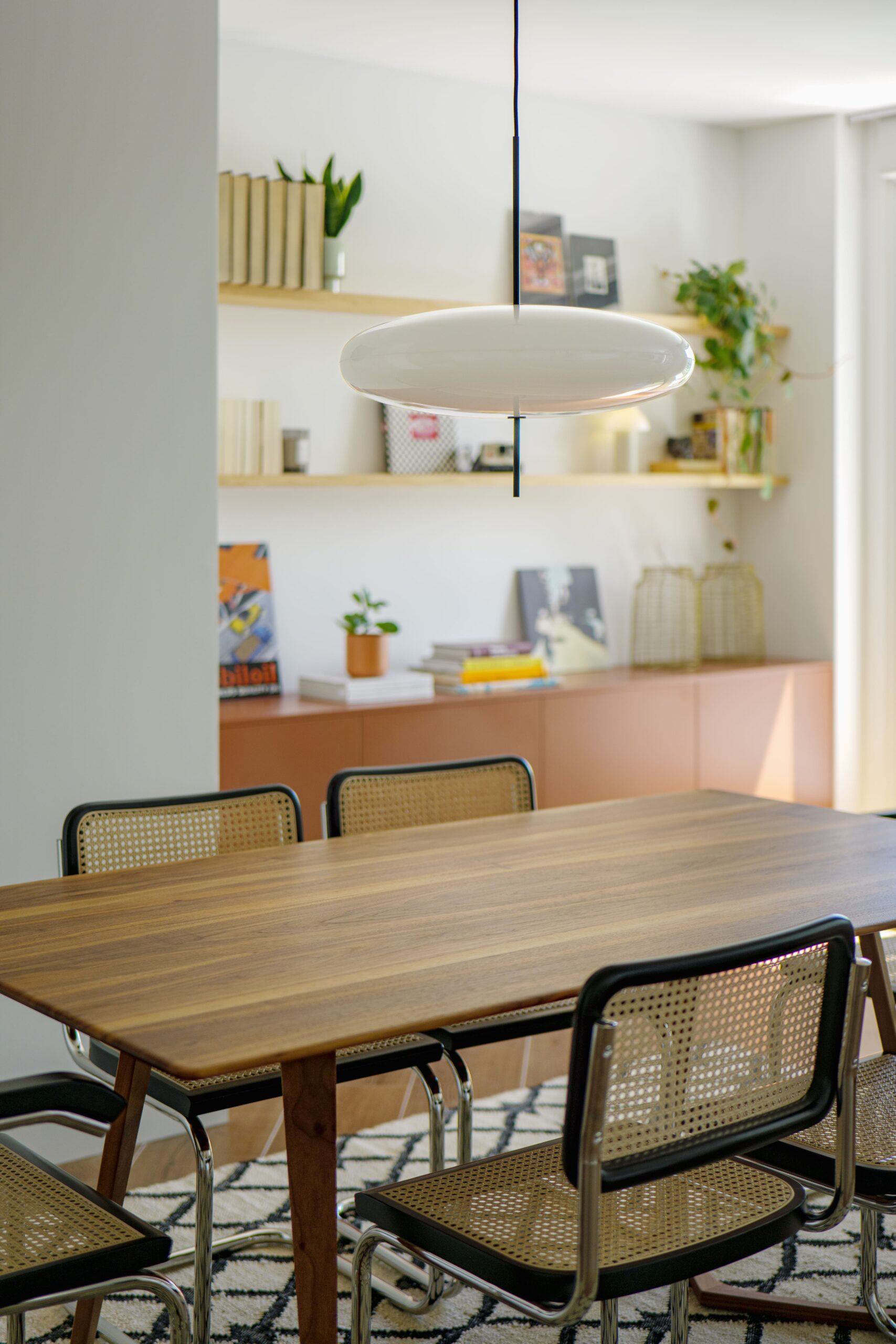 Selección de materiales y modificaciones en la distribución bajo plano para construcción de vivienda de obra nueva por medio de promotora. Diseño de mueble de comedor, cabecero, mueble de baño y cocina a medida por Lasal Estudio, selección de mobiliario, iluminación y decoración.