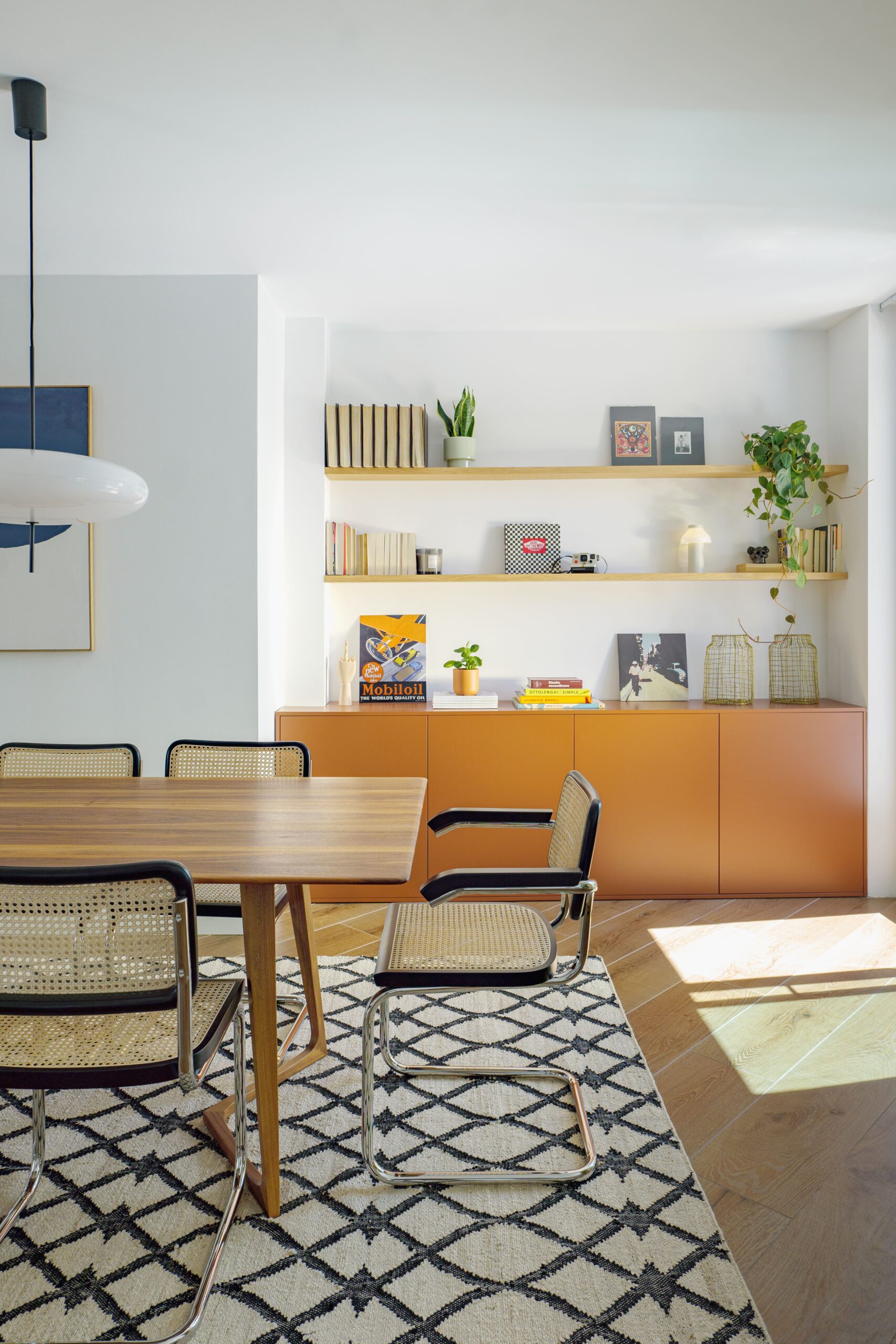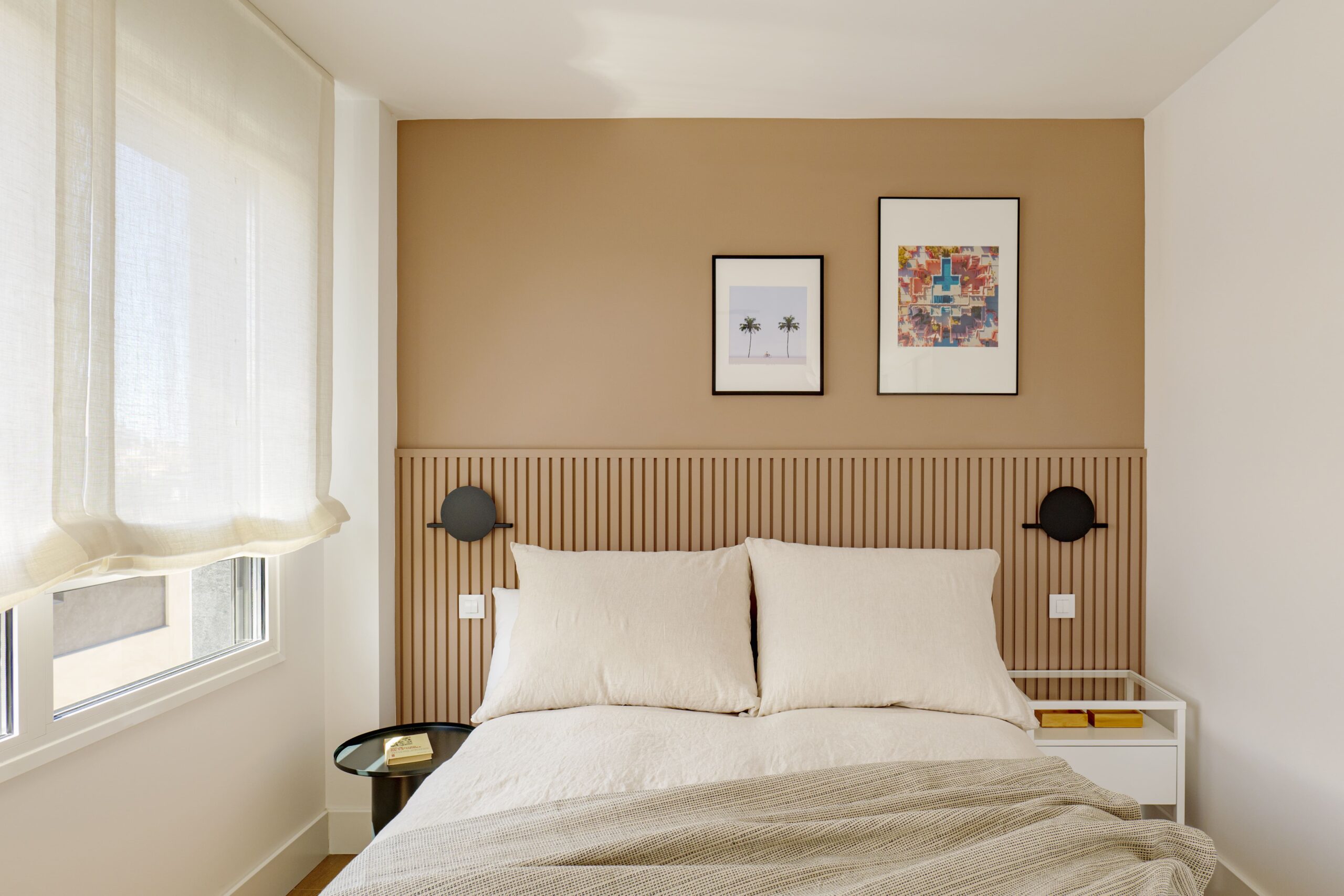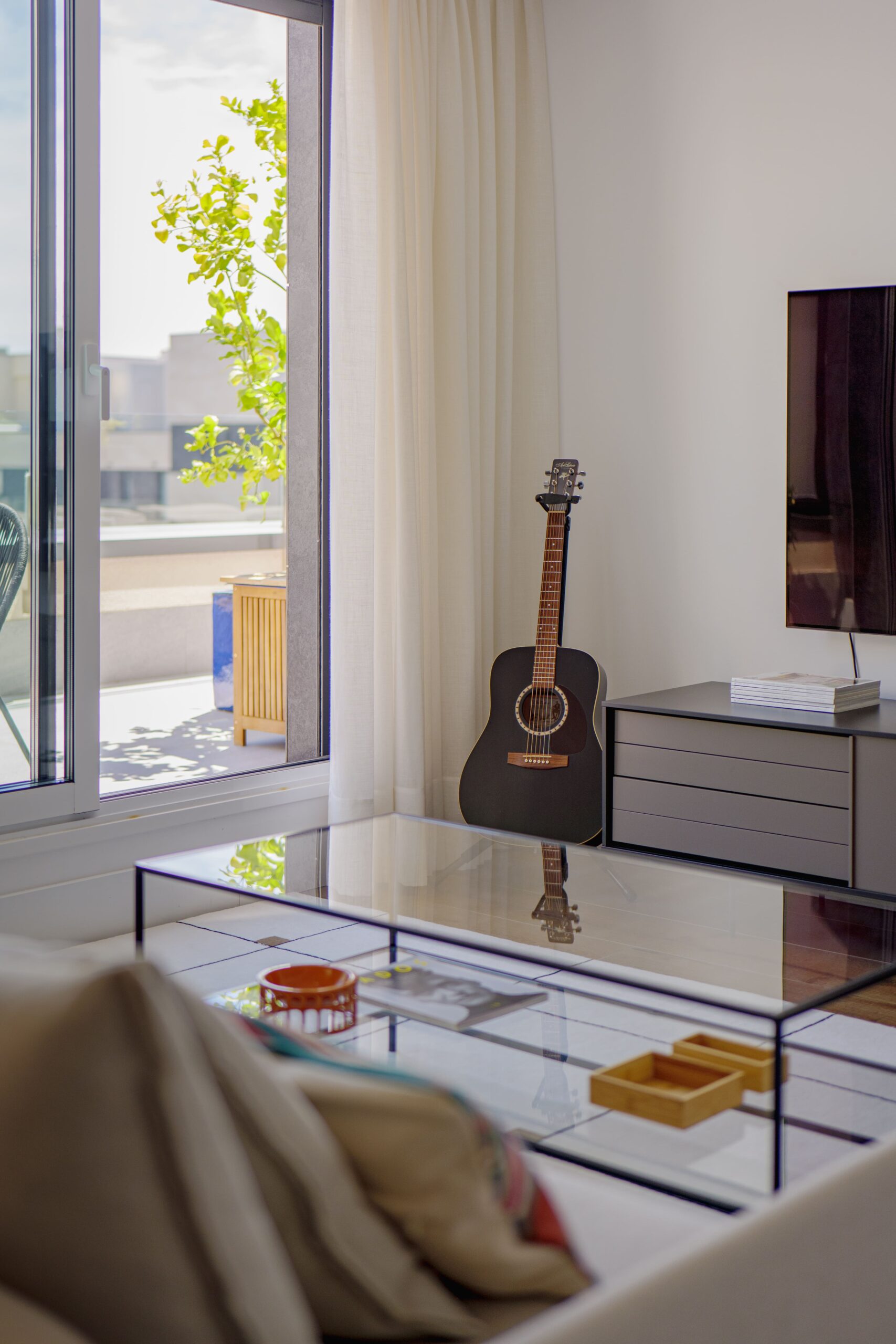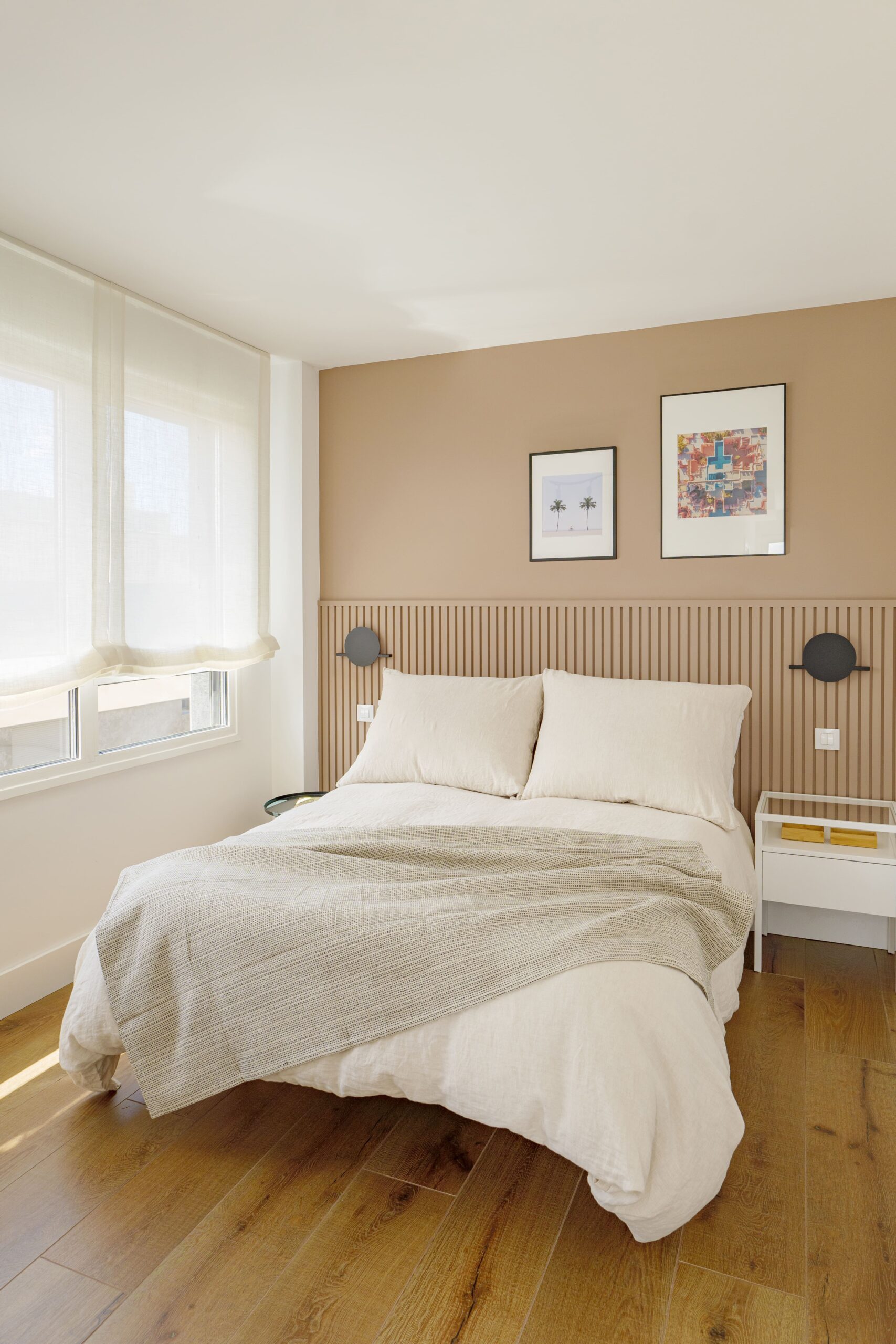 Selección de materiales y modificaciones en la distribución bajo plano para construcción de vivienda de obra nueva por medio de promotora. Diseño de mueble de comedor, cabecero, mueble de baño y cocina a medida por Lasal Estudio, selección de mobiliario, iluminación y decoración.