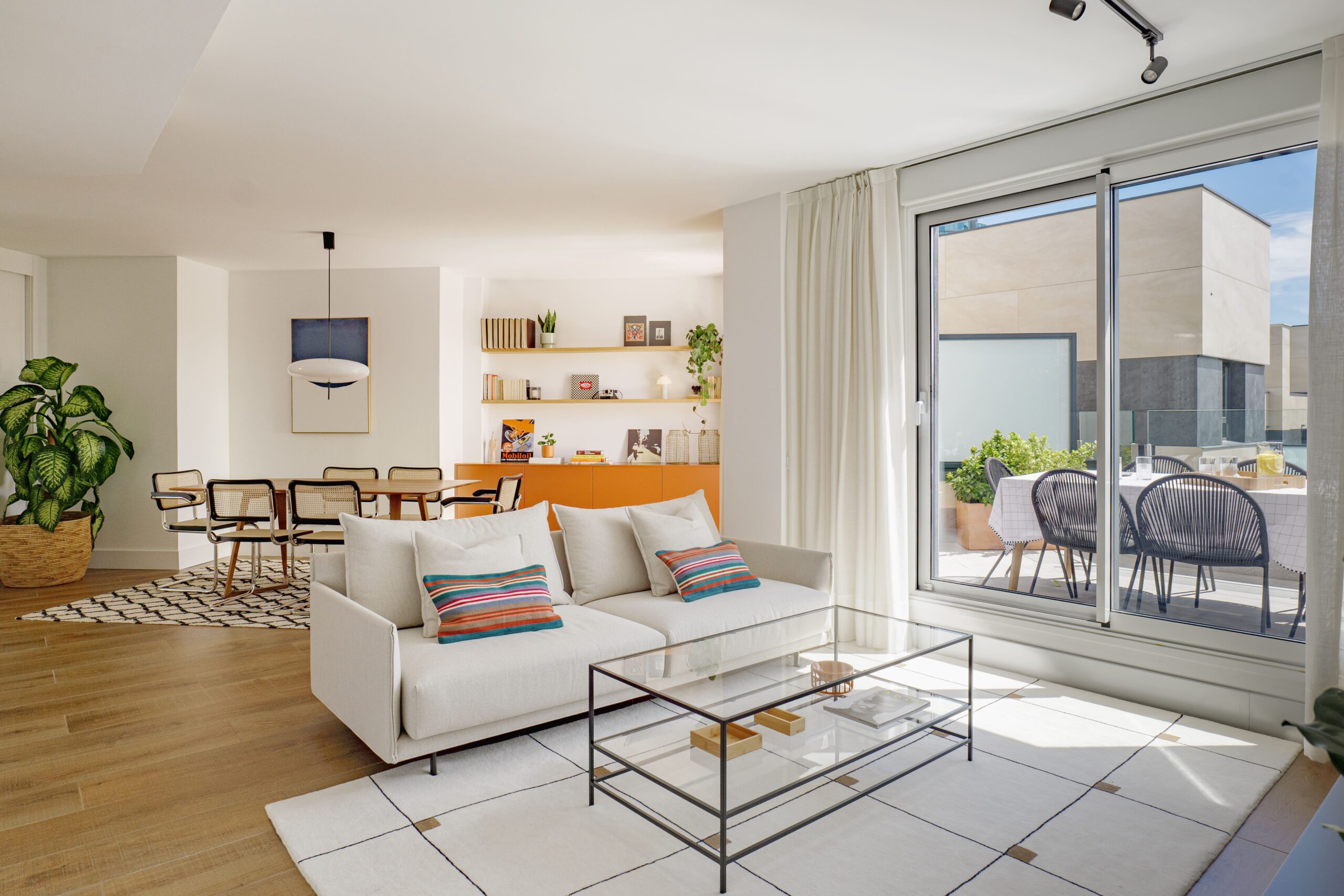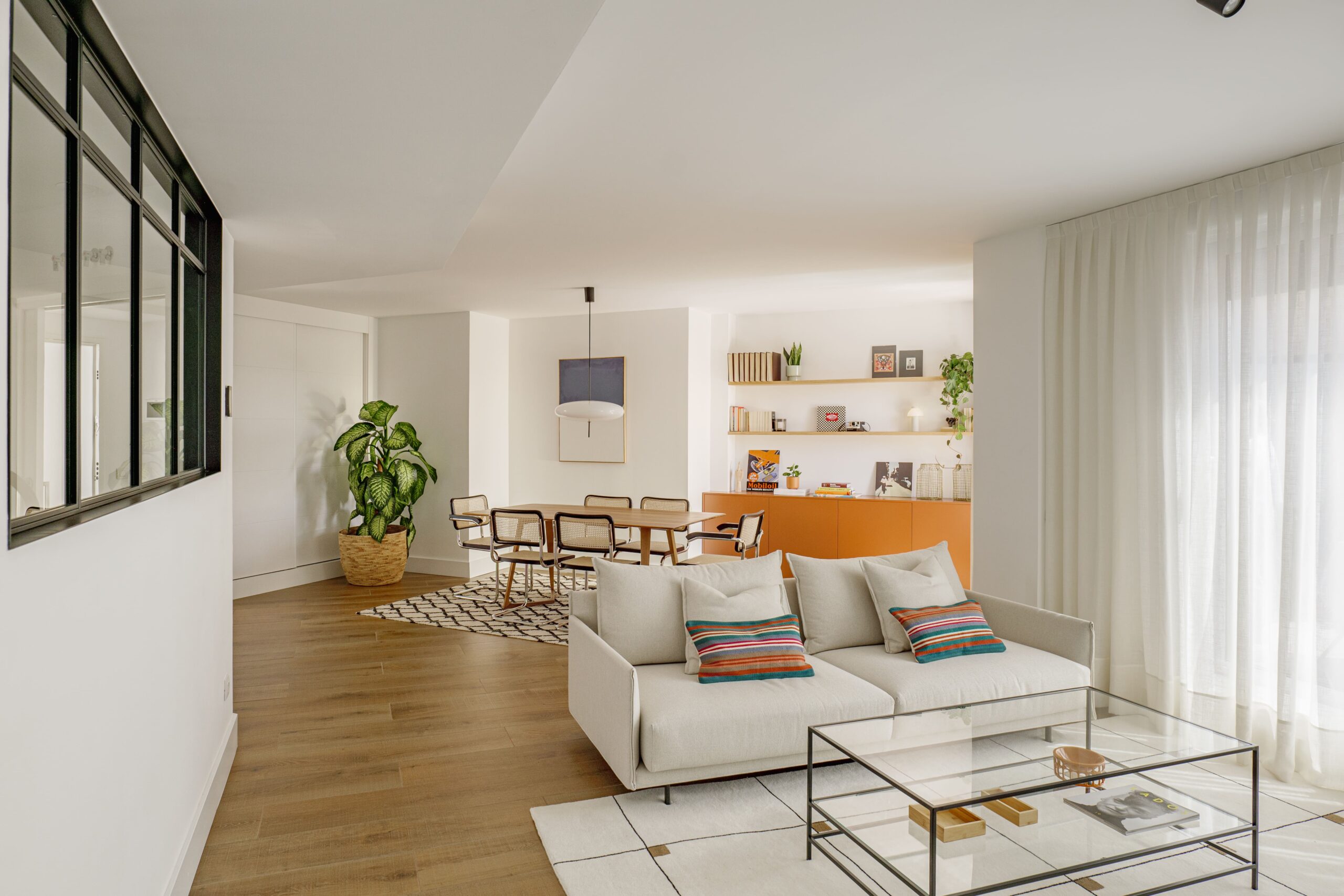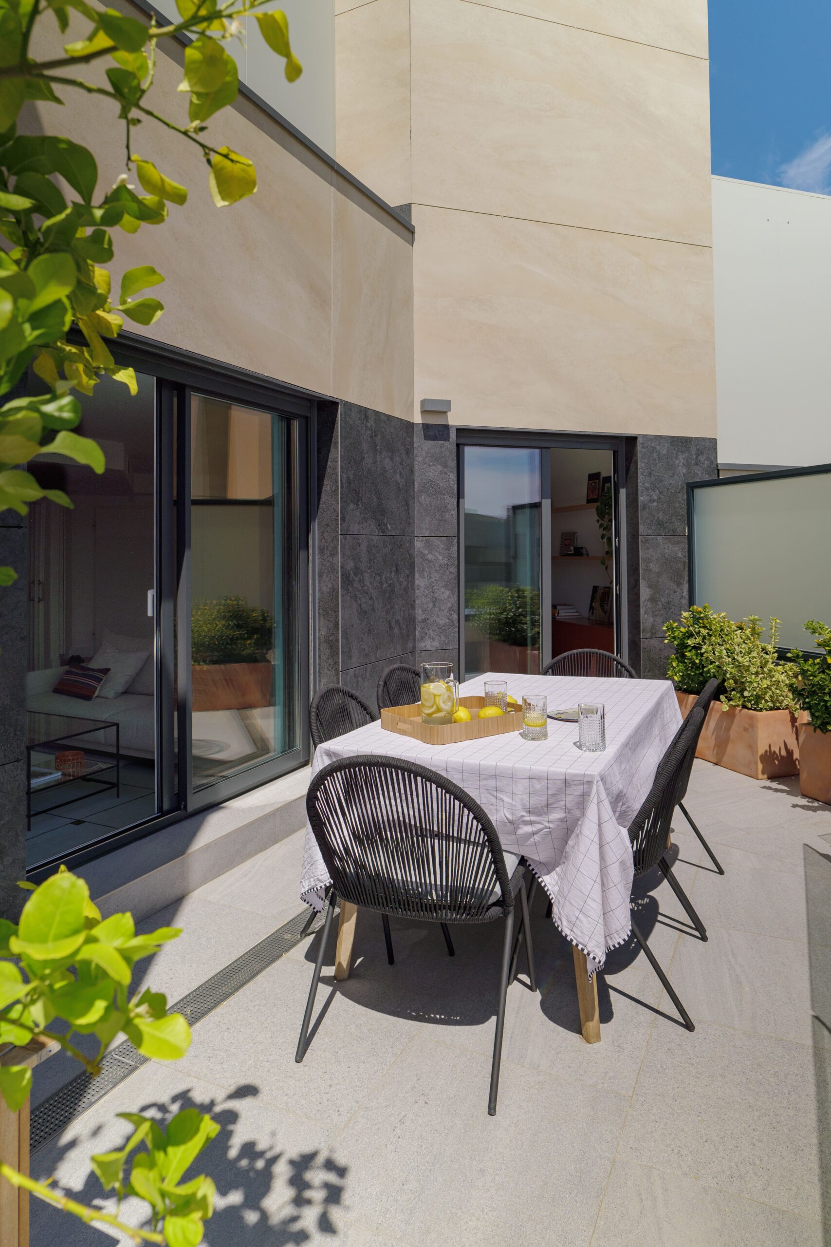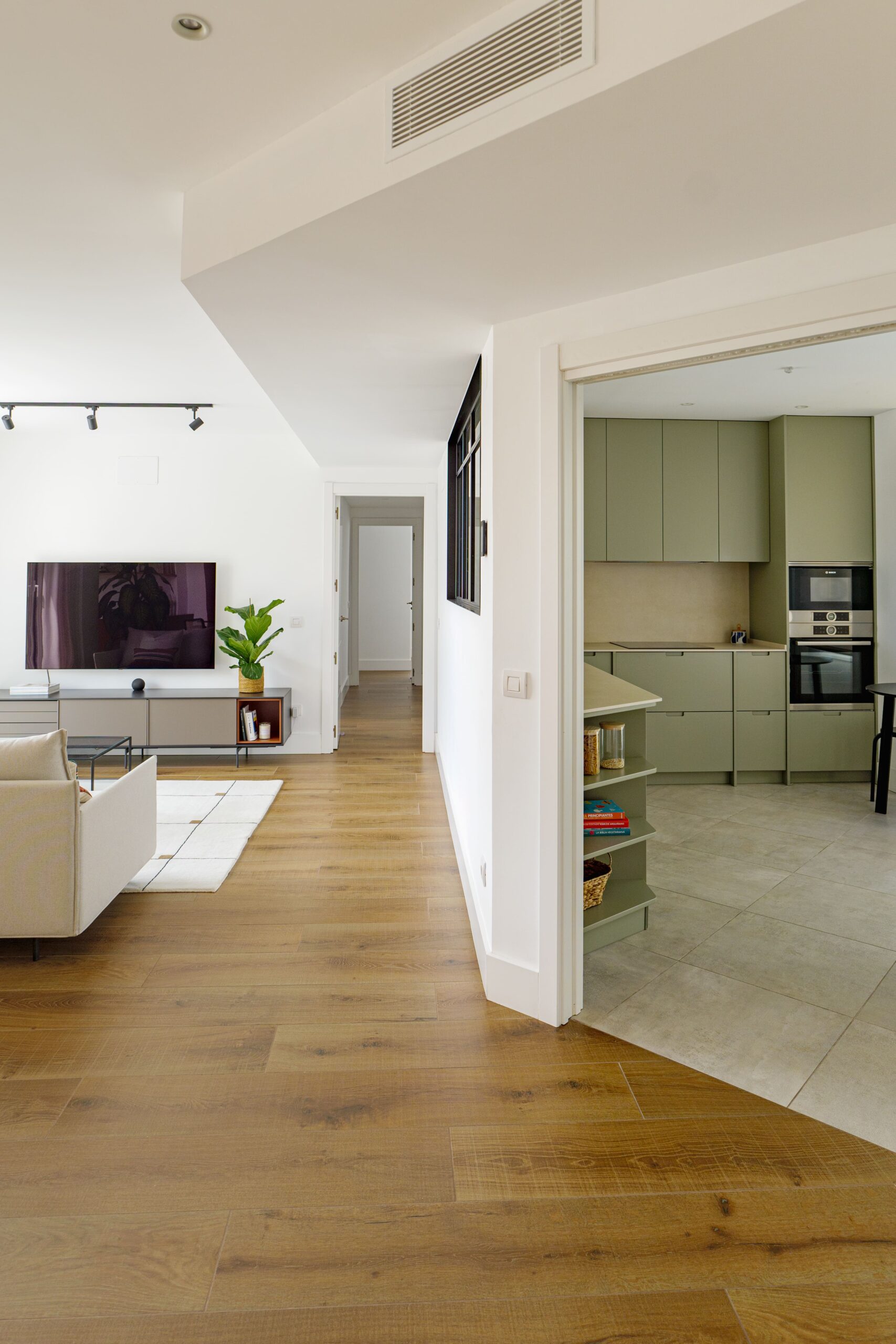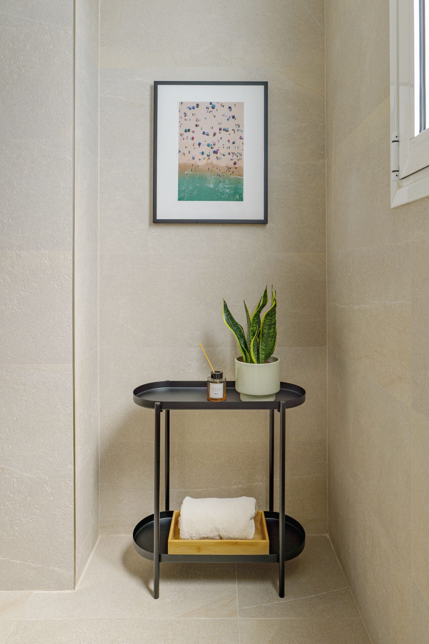 Selección de materiales y modificaciones en la distribución bajo plano para construcción de vivienda de obra nueva por medio de promotora. Diseño de mueble de comedor, cabecero, mueble de baño y cocina a medida por Lasal Estudio, selección de mobiliario, iluminación y decoración.