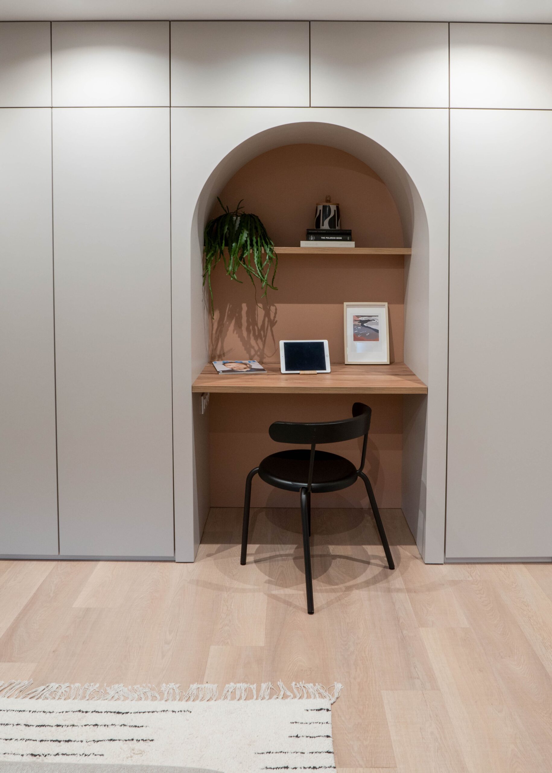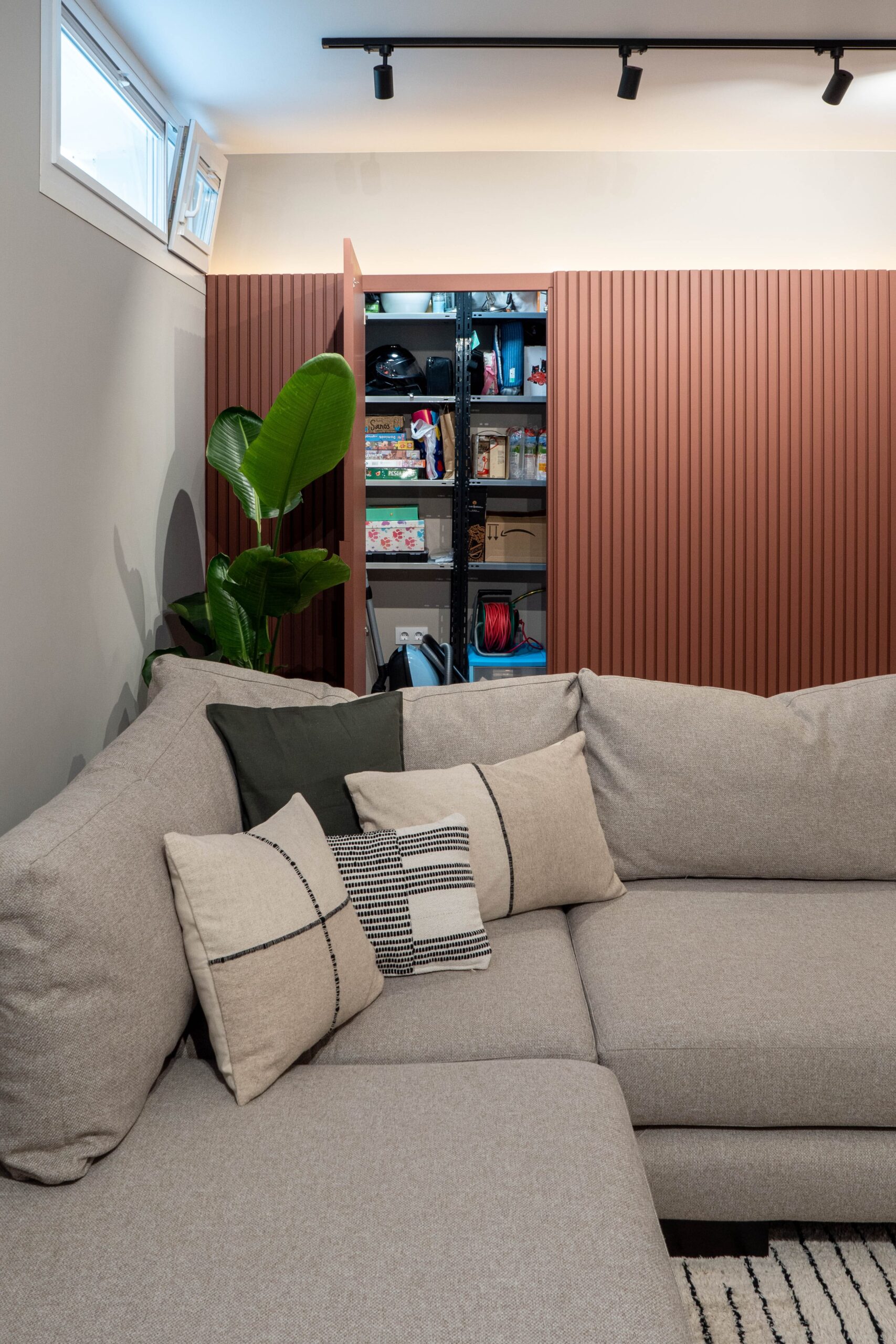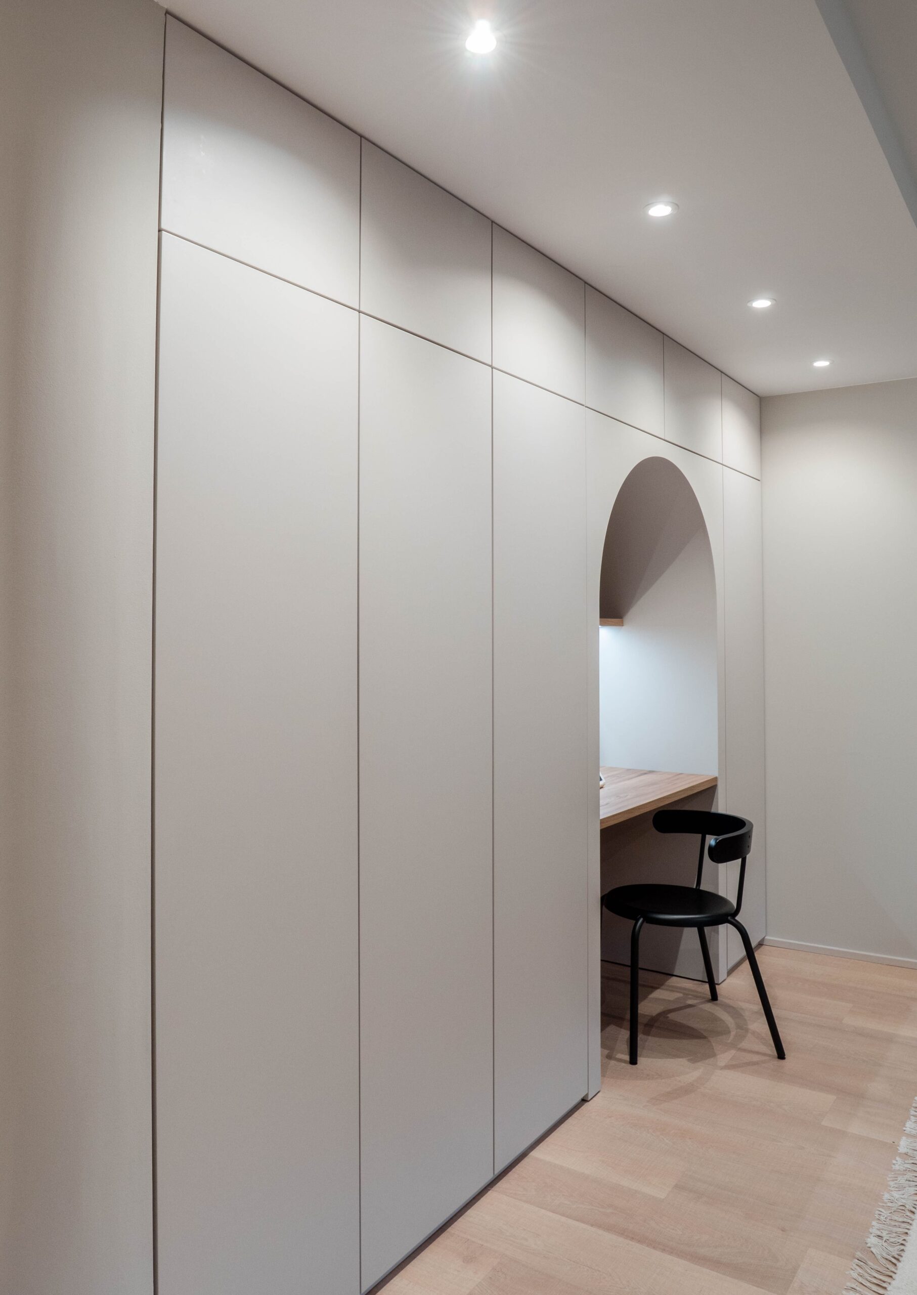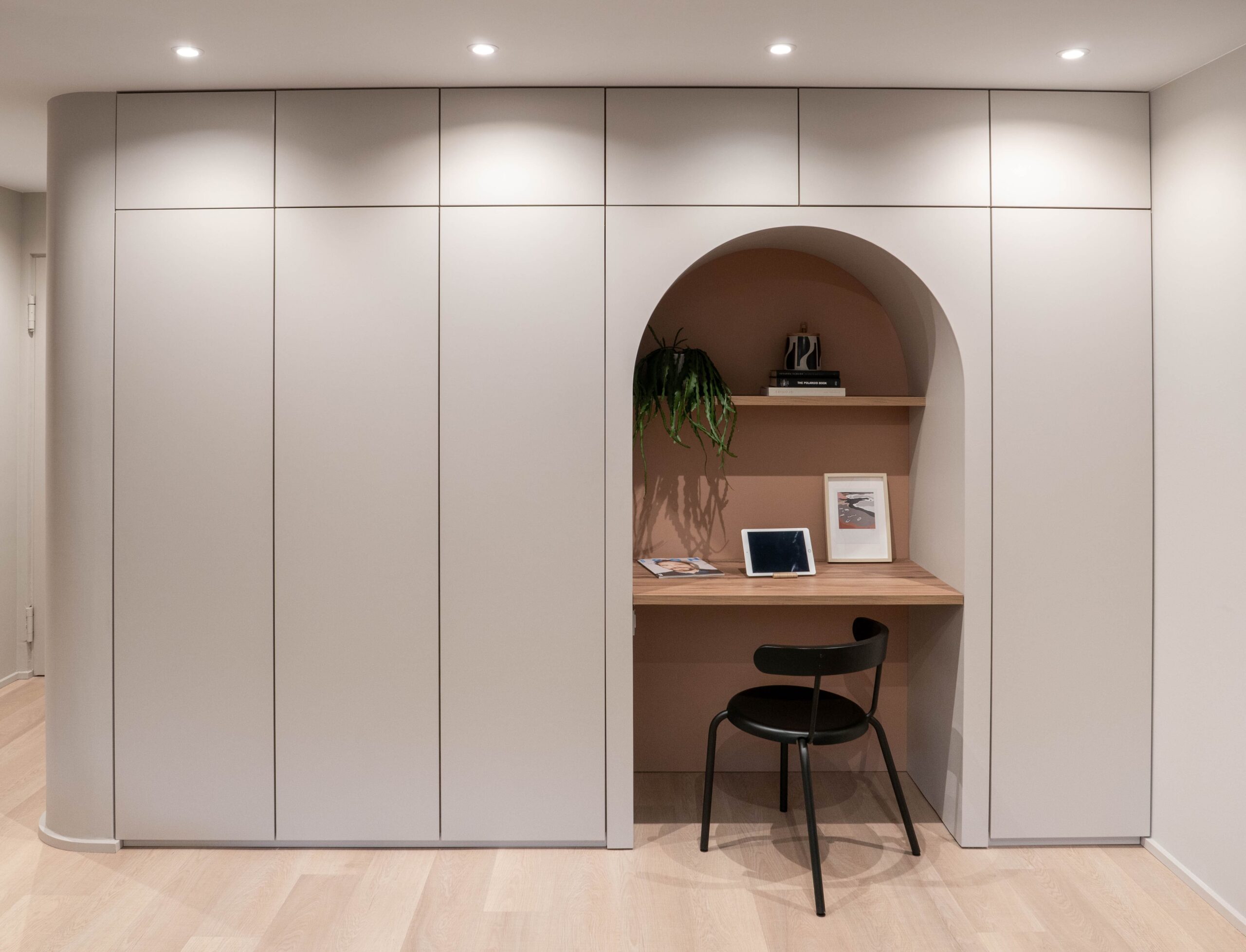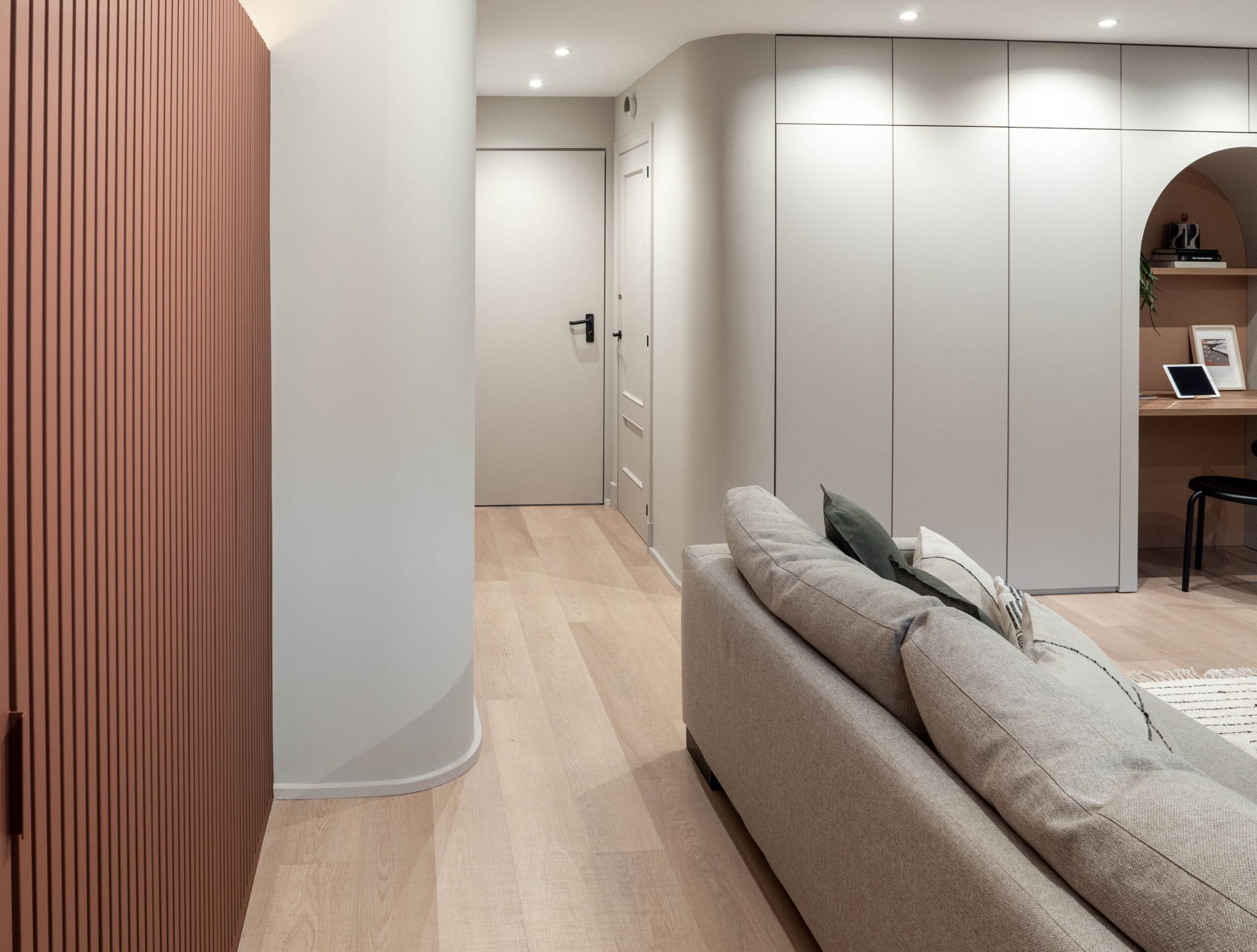 Reforma completa de vivienda con cambio en la distribución del espacio, con diseño de cerramiento, armario con escritorio y mueble de baño/lavandería a medida por Lasal Estudio, selección de mobiliario, iluminación y decoración.