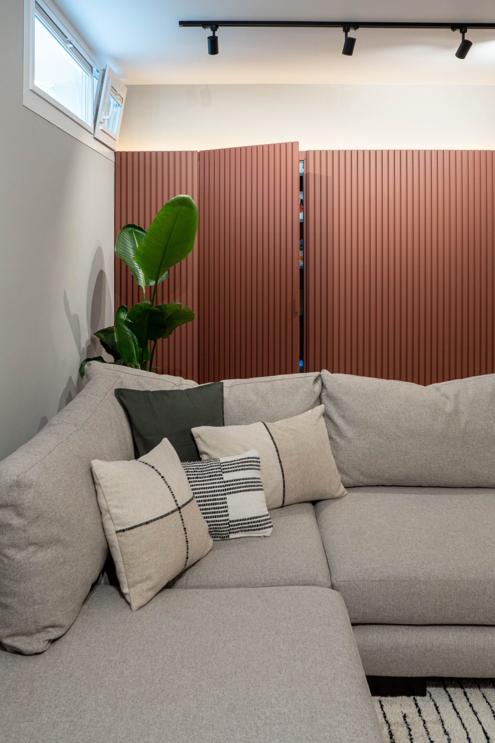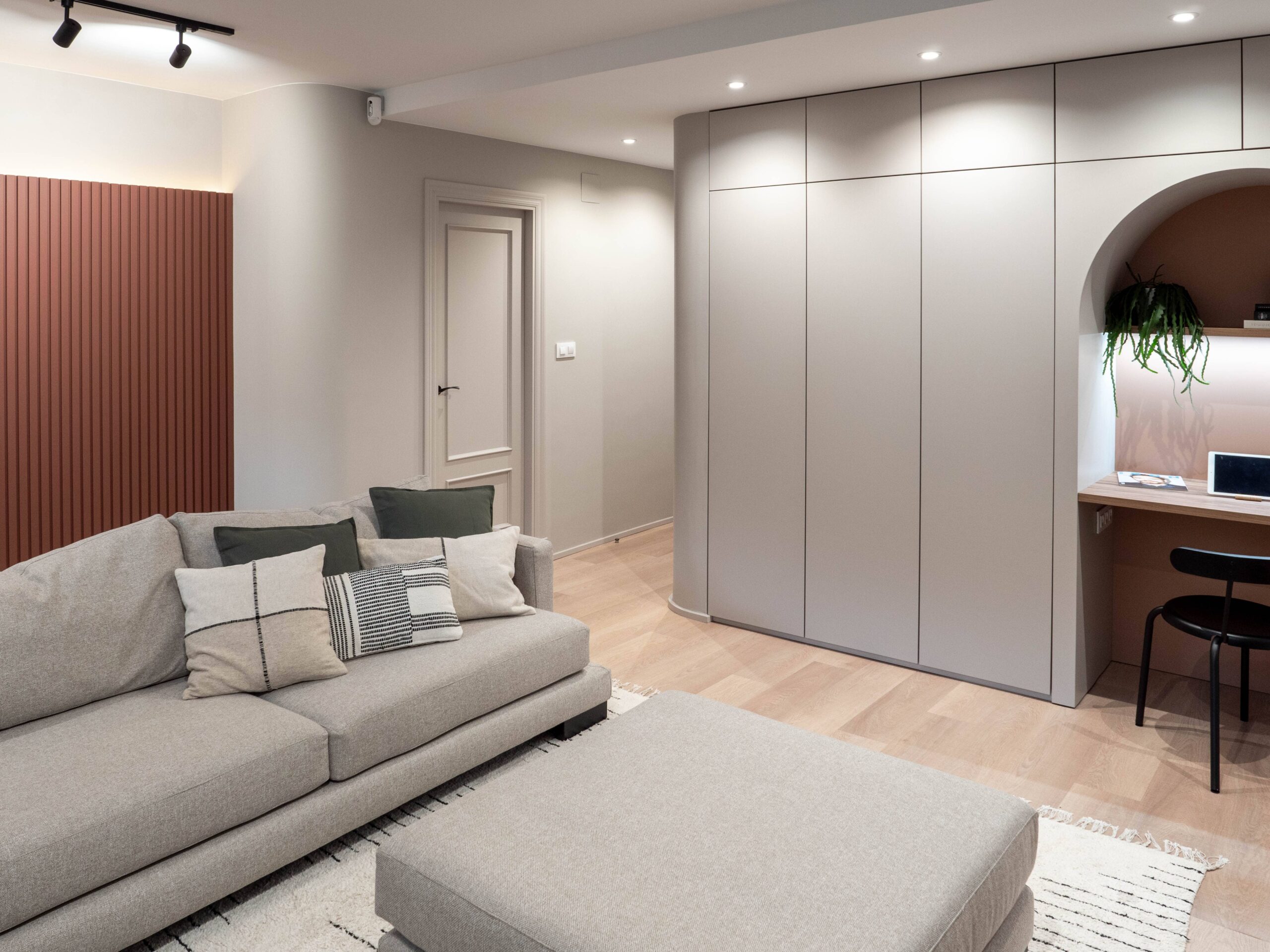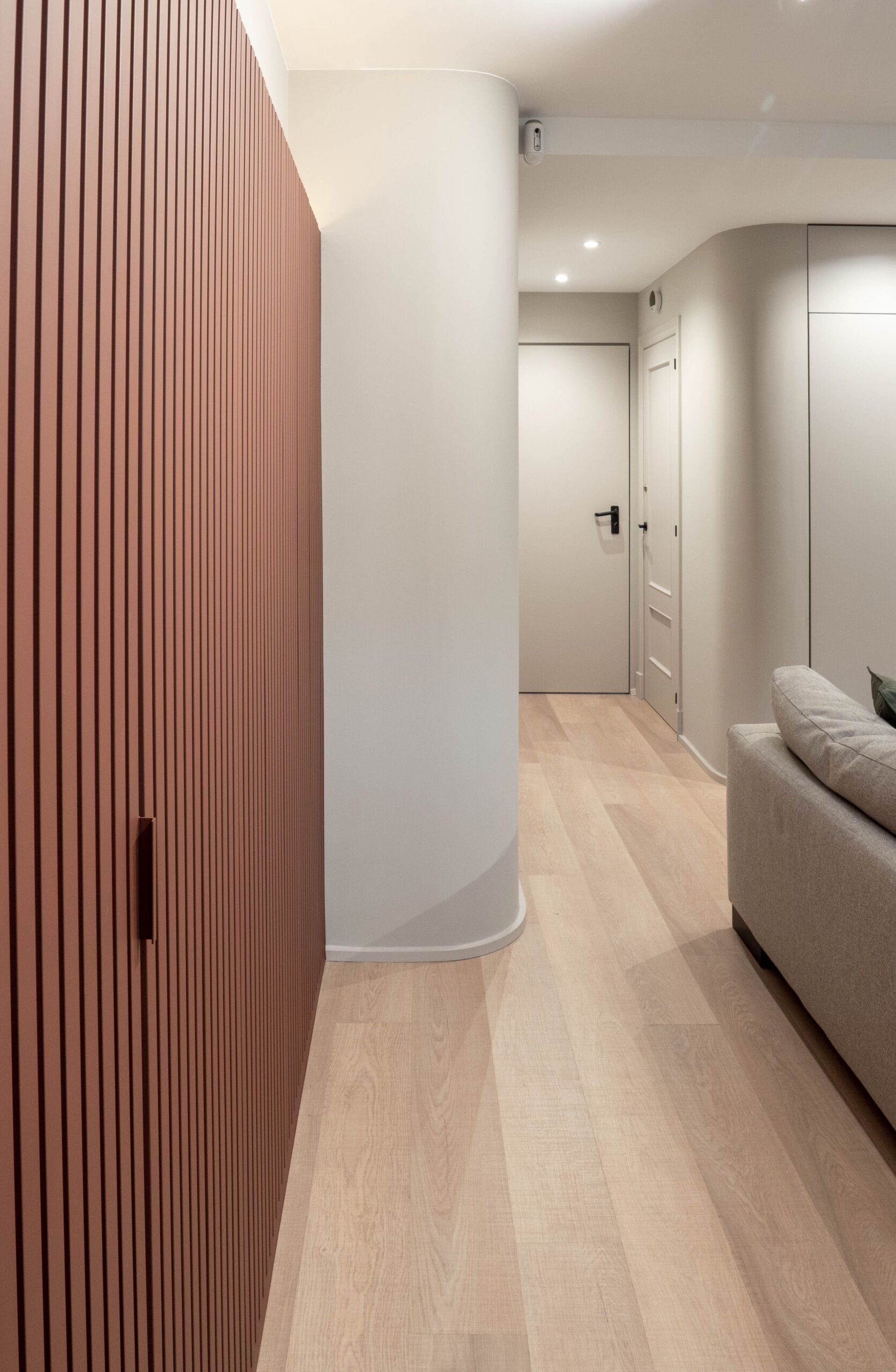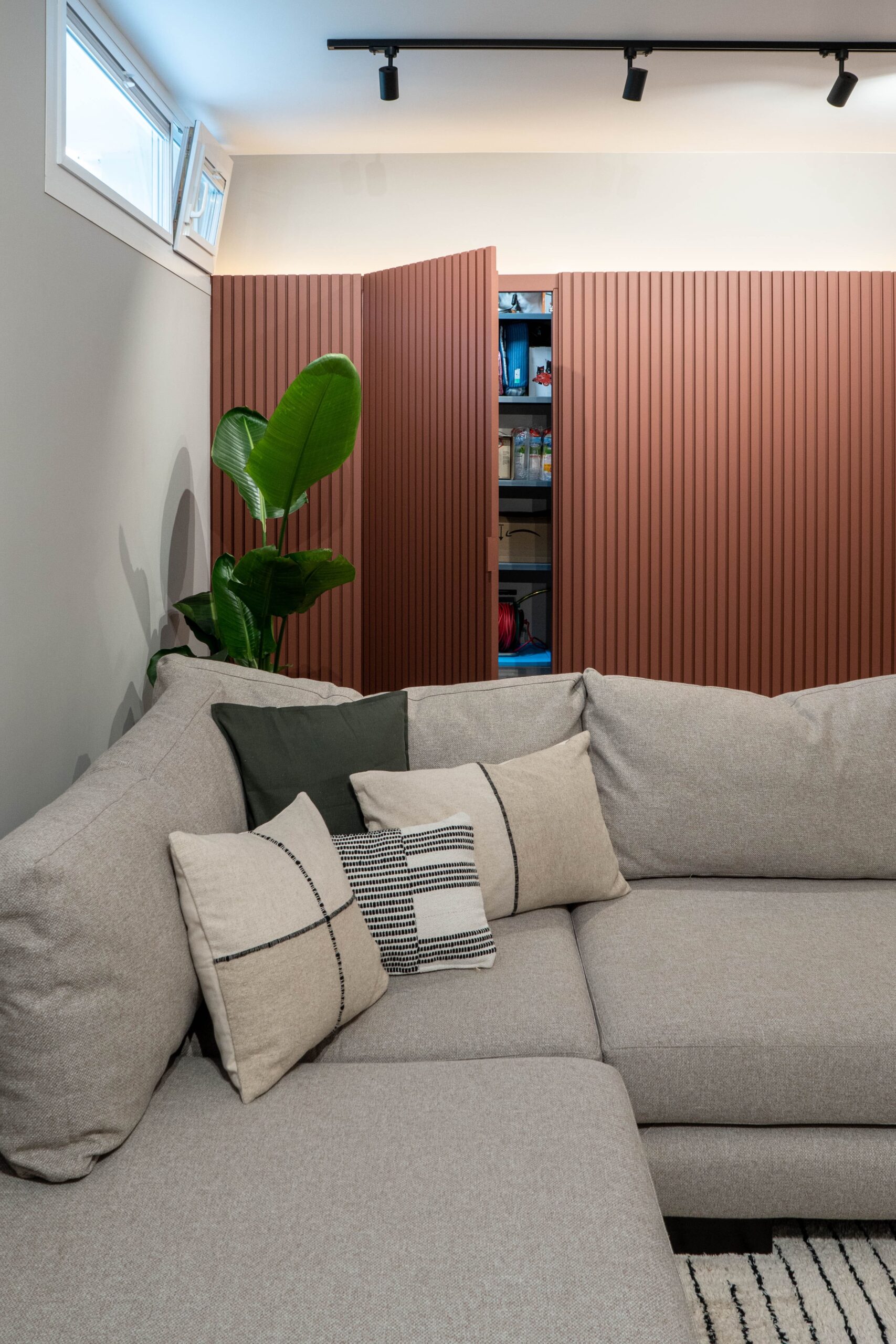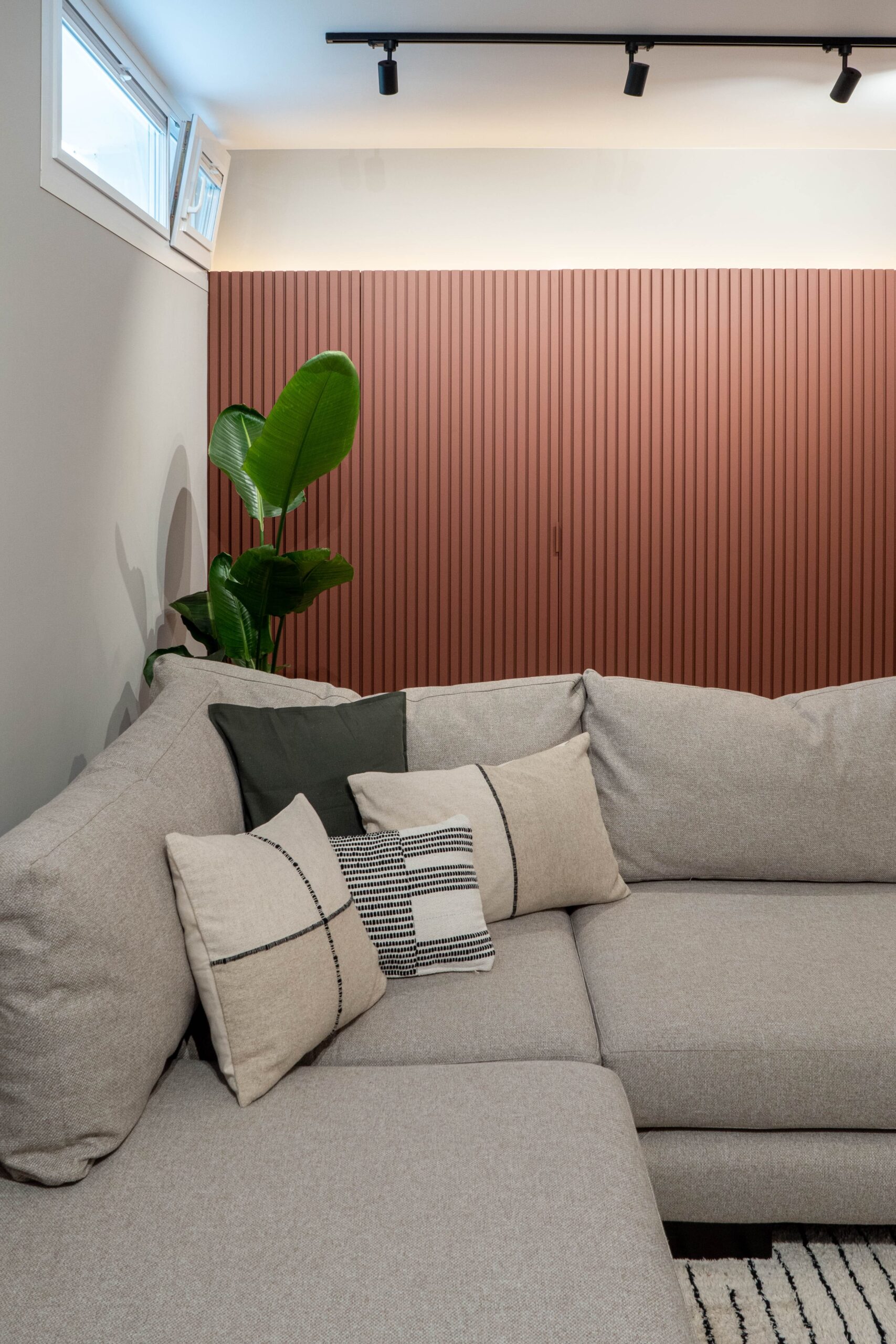 Reforma completa de vivienda con cambio en la distribución del espacio, con diseño de cerramiento, armario con escritorio y mueble de baño/lavandería a medida por Lasal Estudio, selección de mobiliario, iluminación y decoración.