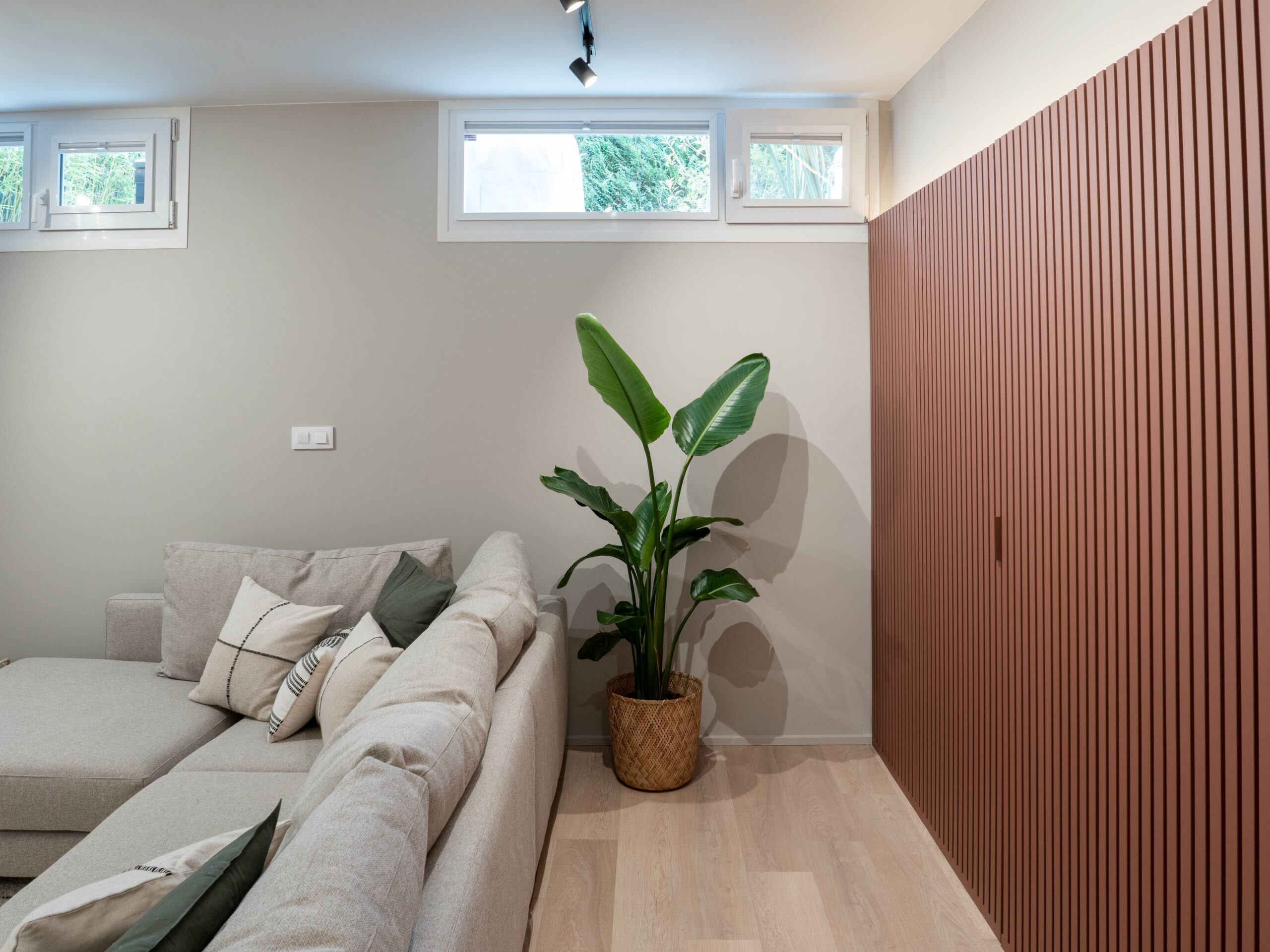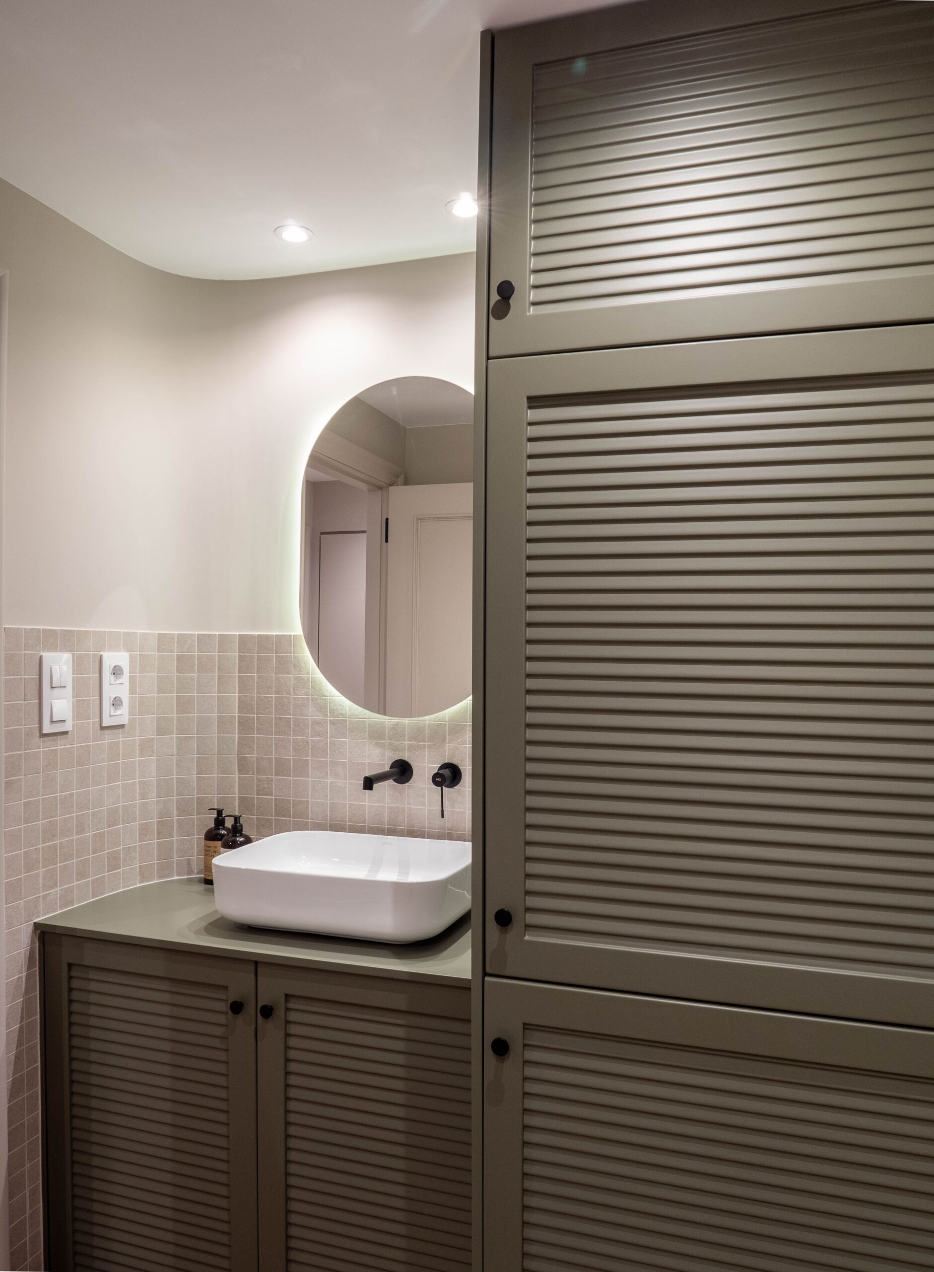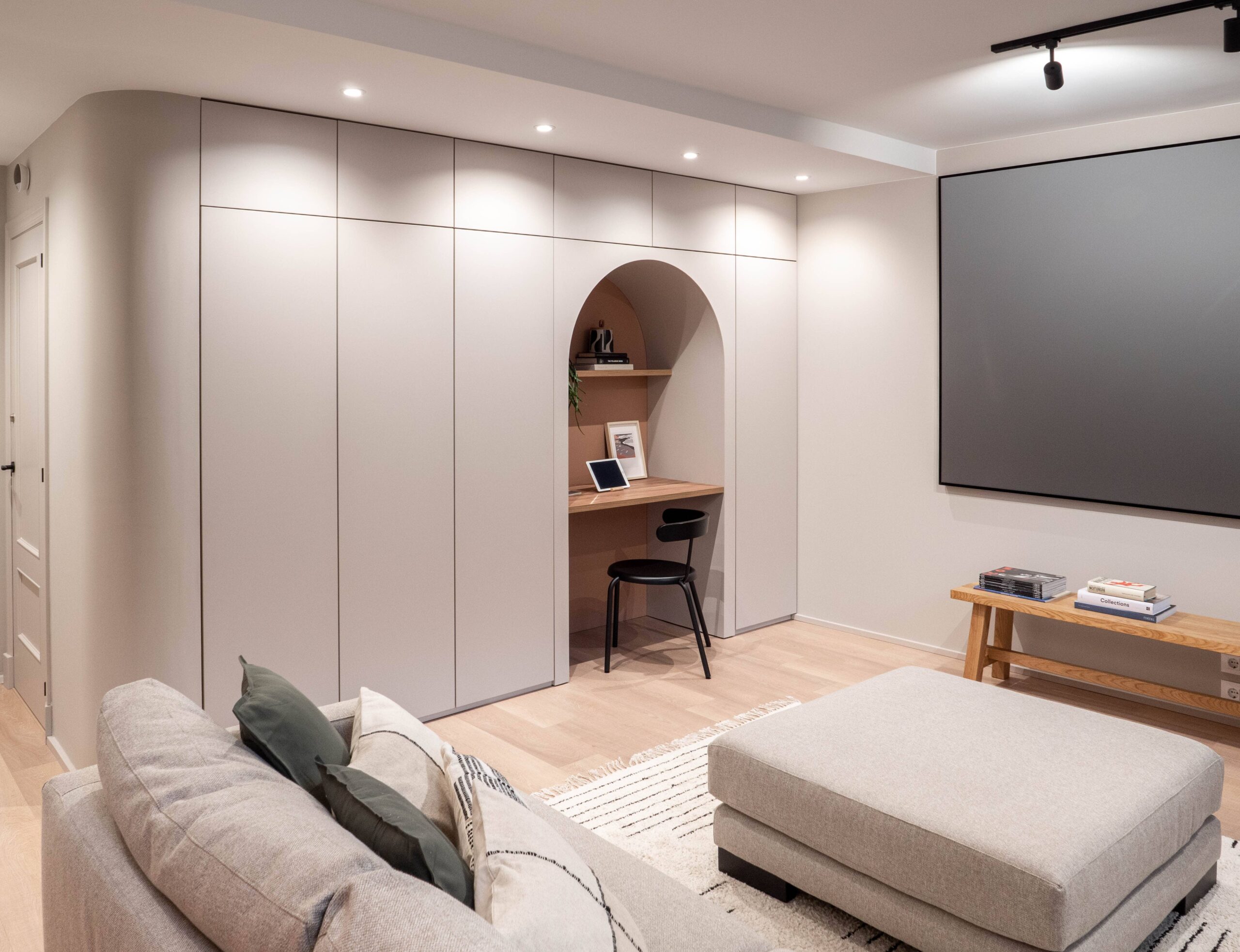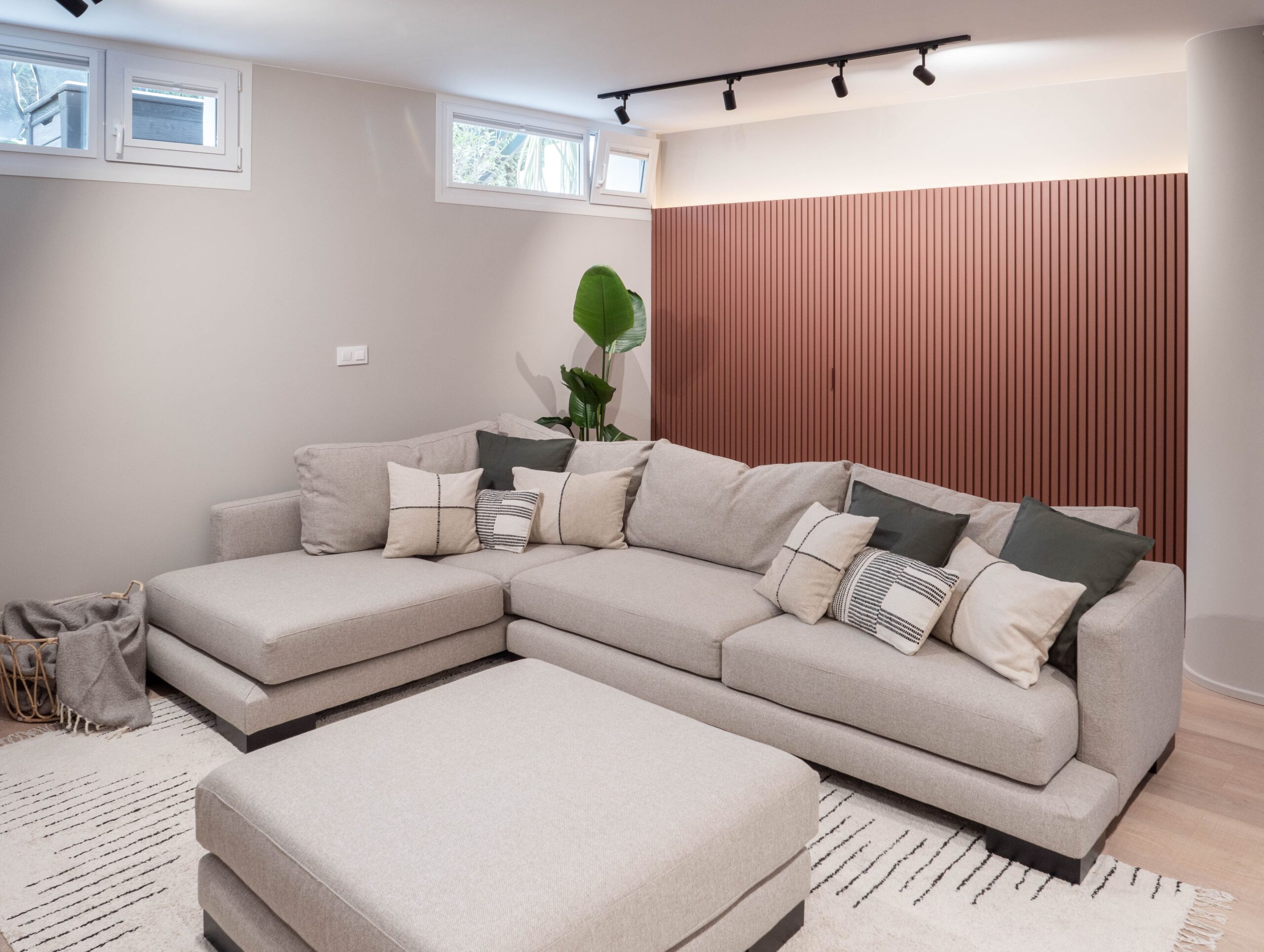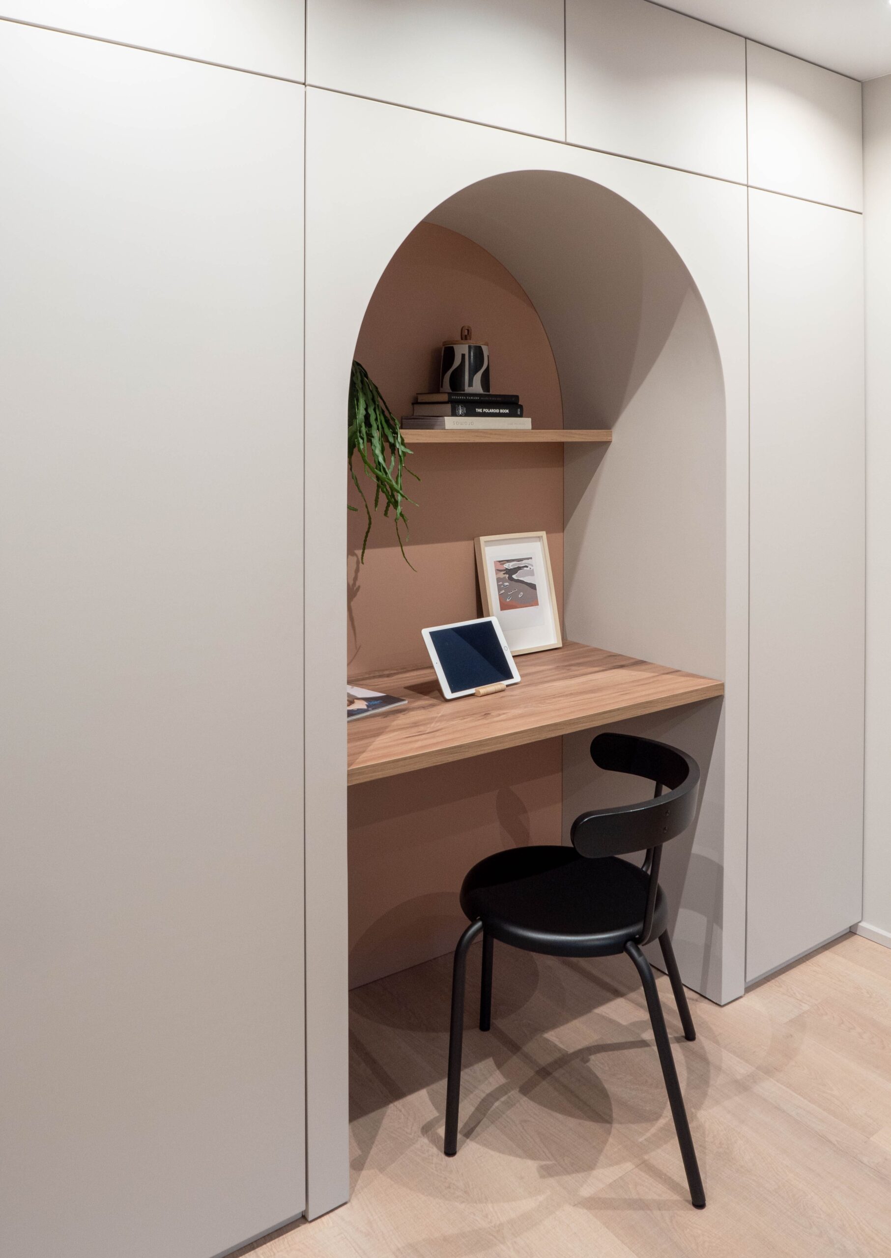 Reforma completa de vivienda con cambio en la distribución del espacio, con diseño de cerramiento, armario con escritorio y mueble de baño/lavandería a medida por Lasal Estudio, selección de mobiliario, iluminación y decoración.