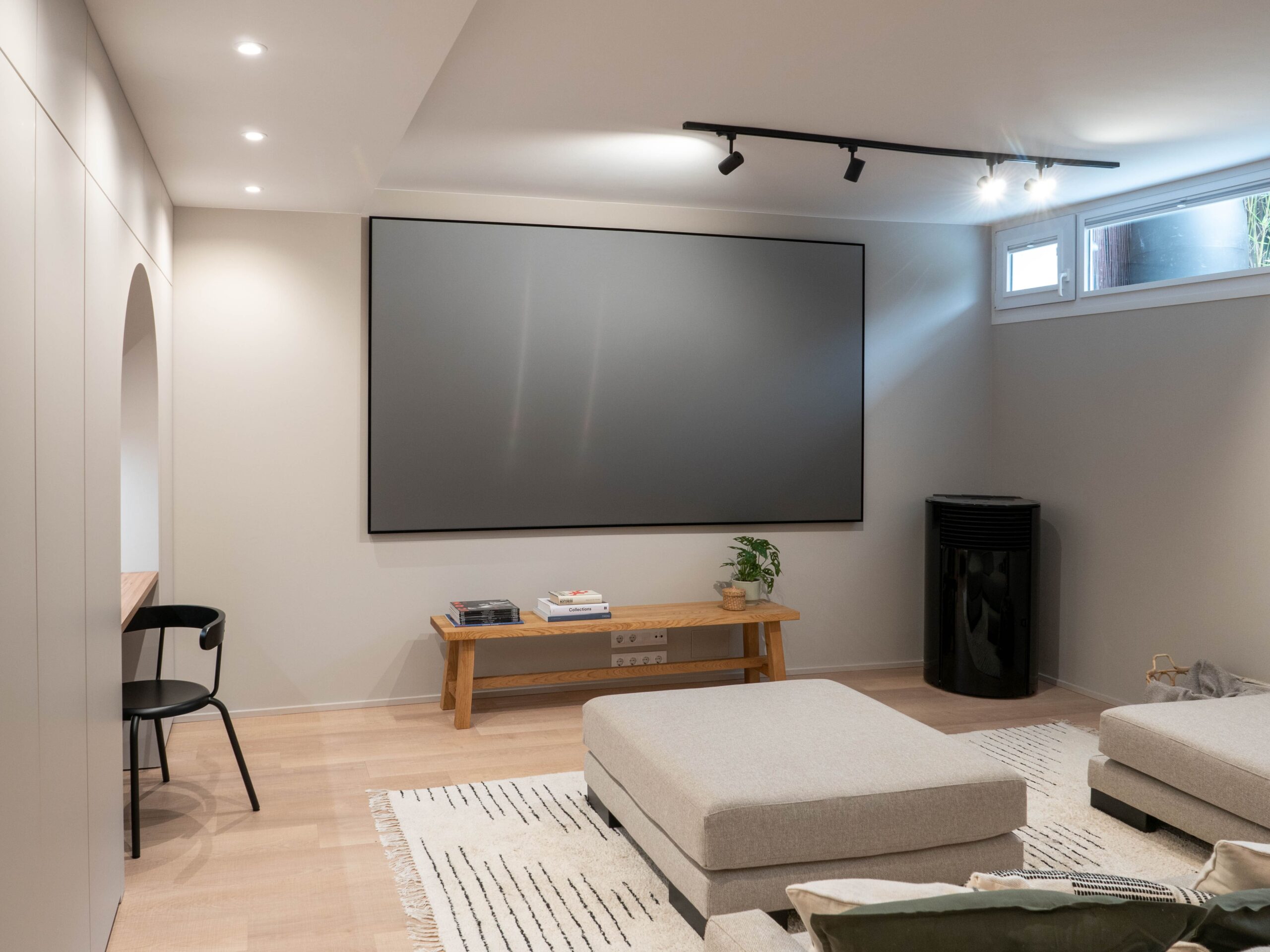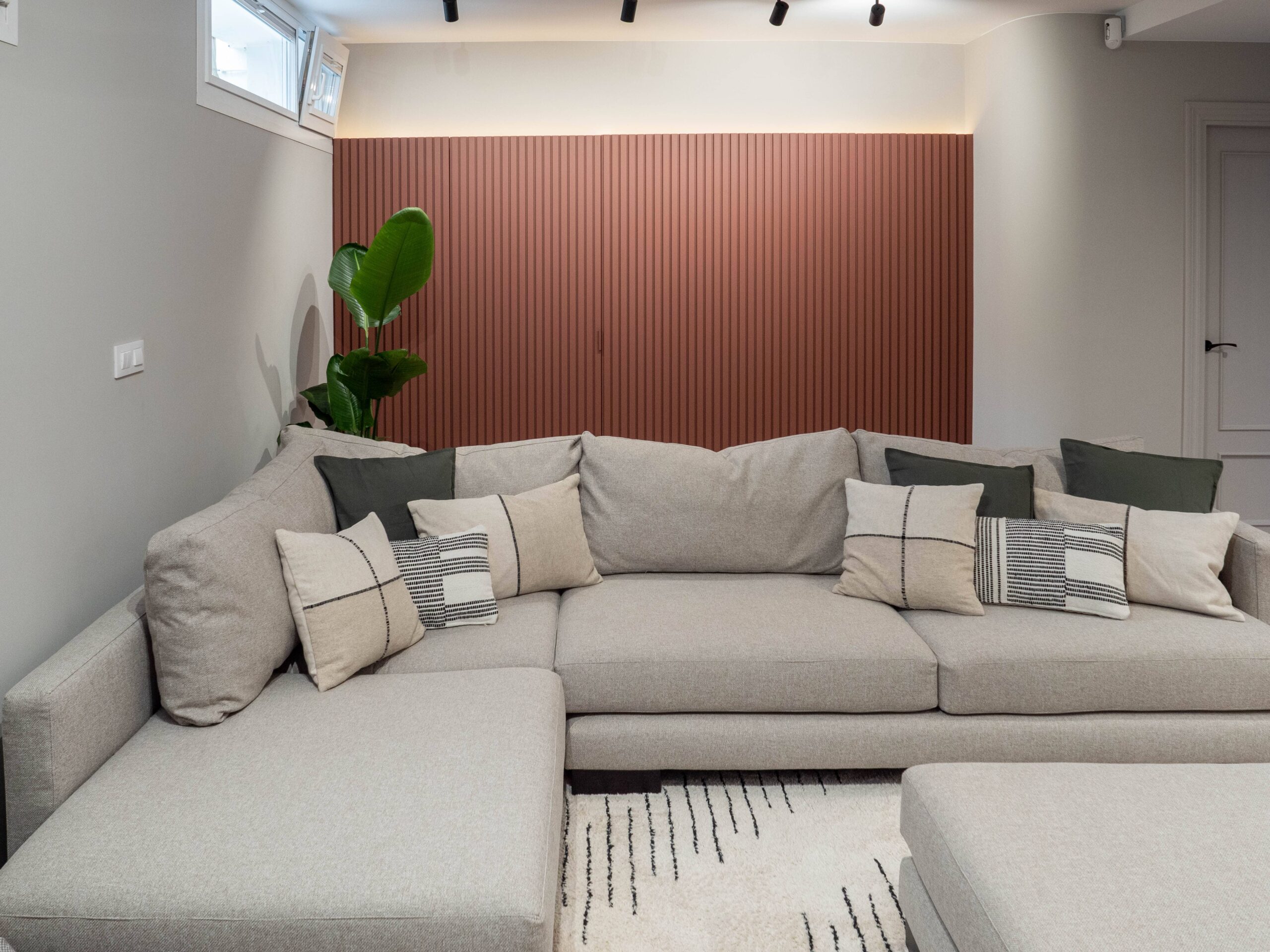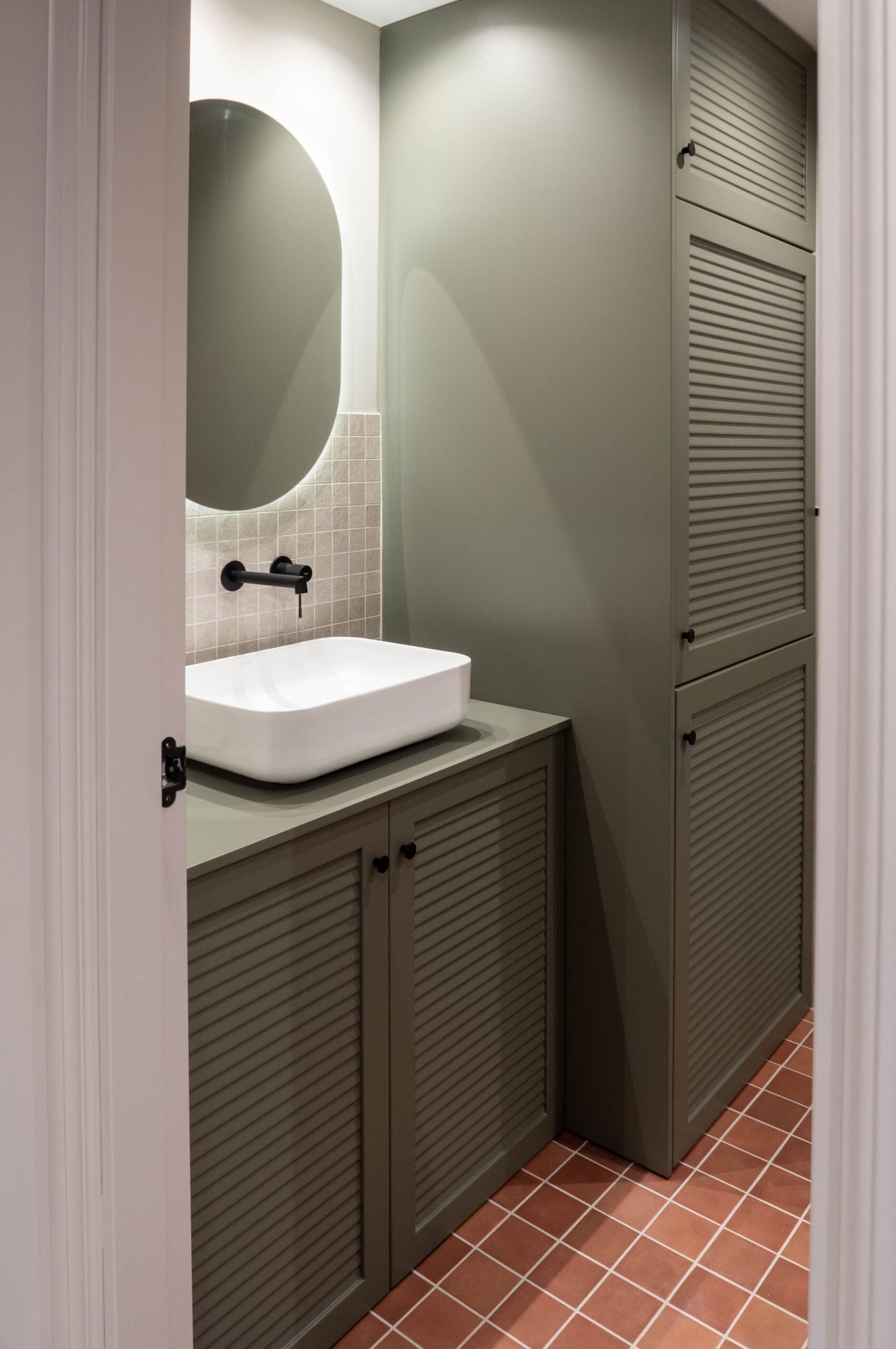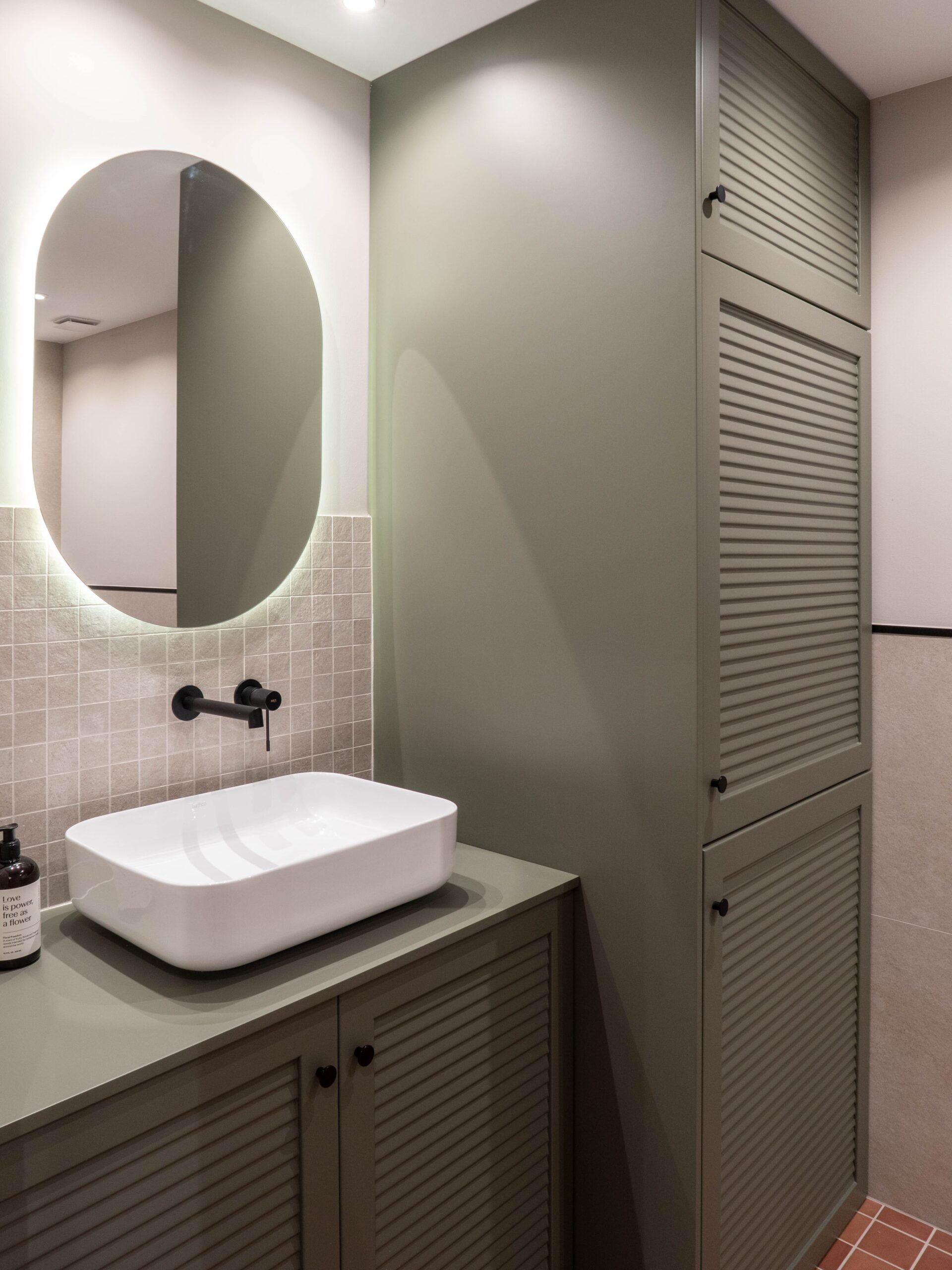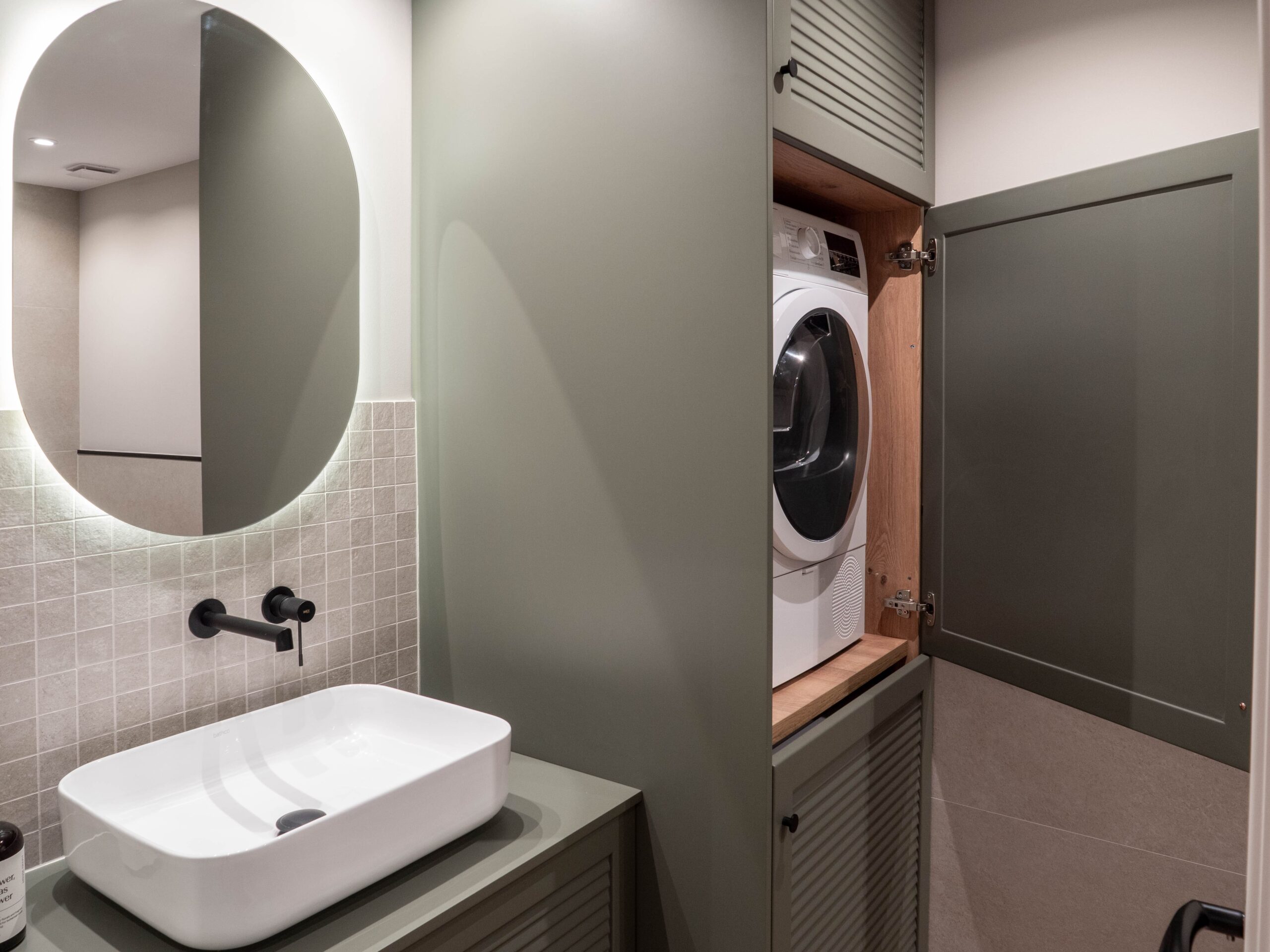 Reforma completa de vivienda con cambio en la distribución del espacio, con diseño de cerramiento, armario con escritorio y mueble de baño/lavandería a medida por Lasal Estudio, selección de mobiliario, iluminación y decoración.